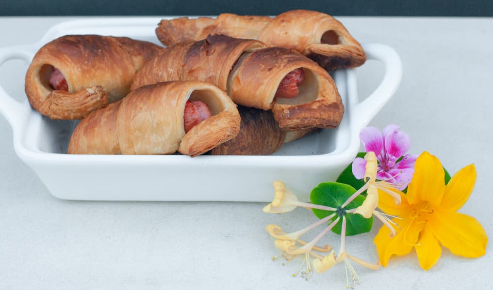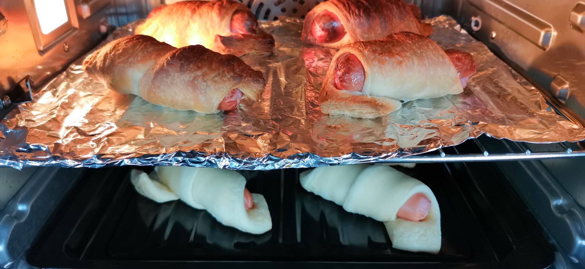 Мы взяли обычное слоеное тесто из недорогого сегмента и молочные сосиски. Сформировали булочки, поставили в мультипечь на режим F-26. На верхнем ярусе сосиски в тесте хорошо приготовились, и мы их вынули. Нижние оставили еще на 20 минут той же программы.