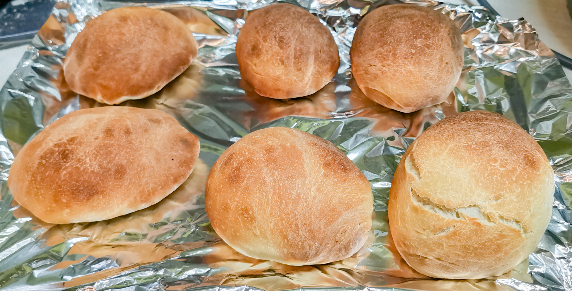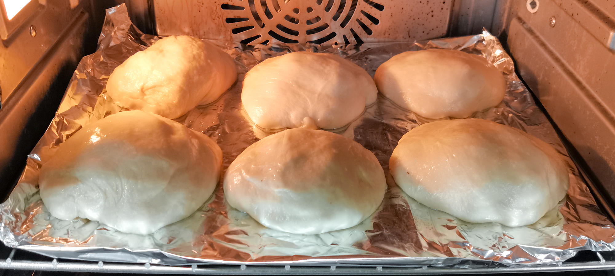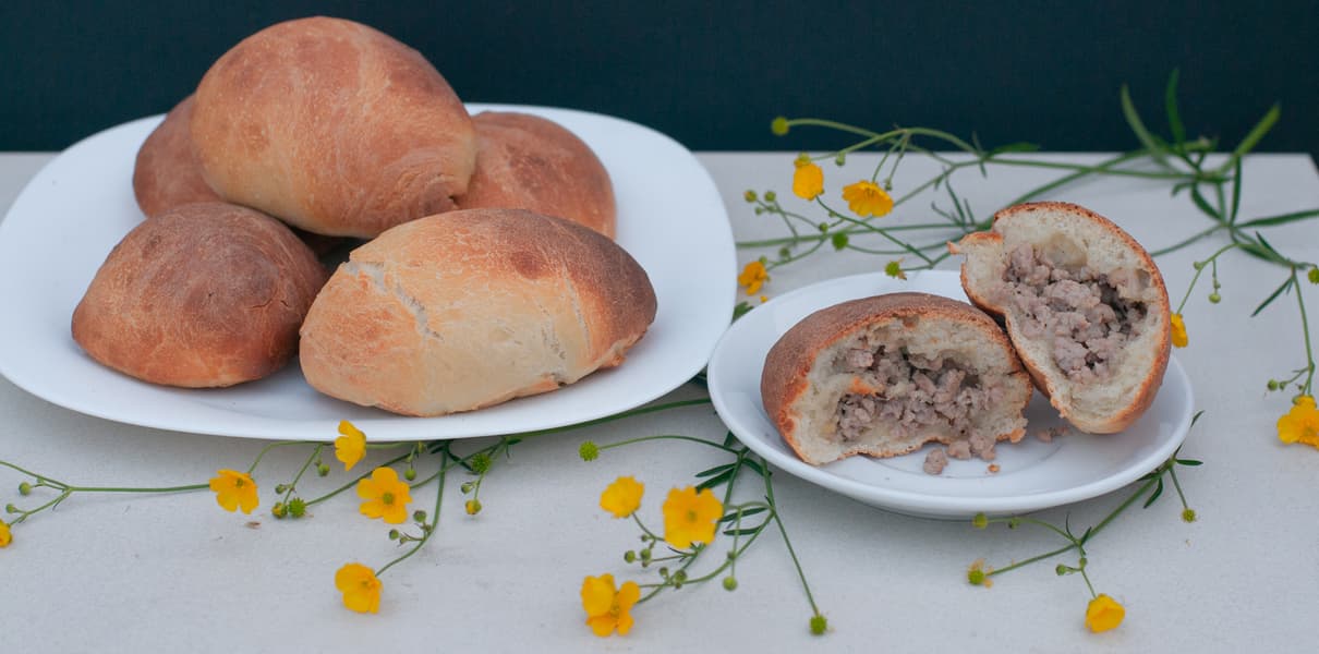 Из дрожжевого теста и фарша мы сформировали крупные пирожки, подержали их в камере прибора на расстойке 20 минут и выпекали их на режиме гриль с паром при 200 °C.