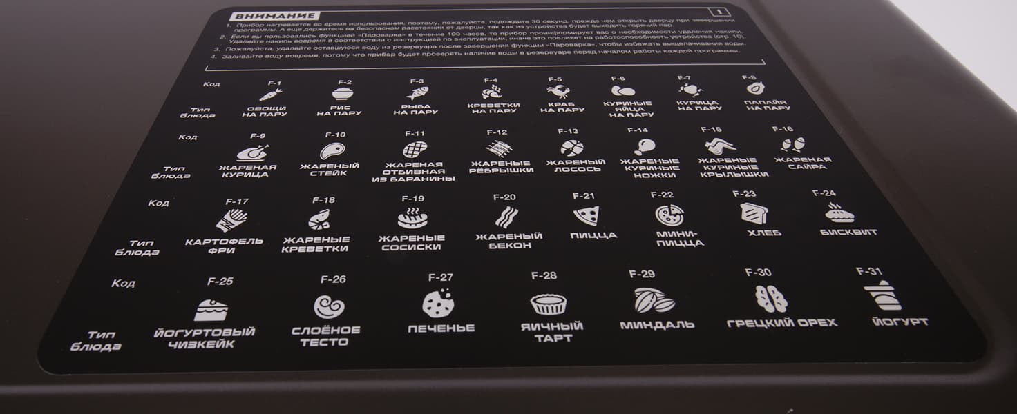 Сверху мультипечи наклеена таблица с основными автоматическими программами.