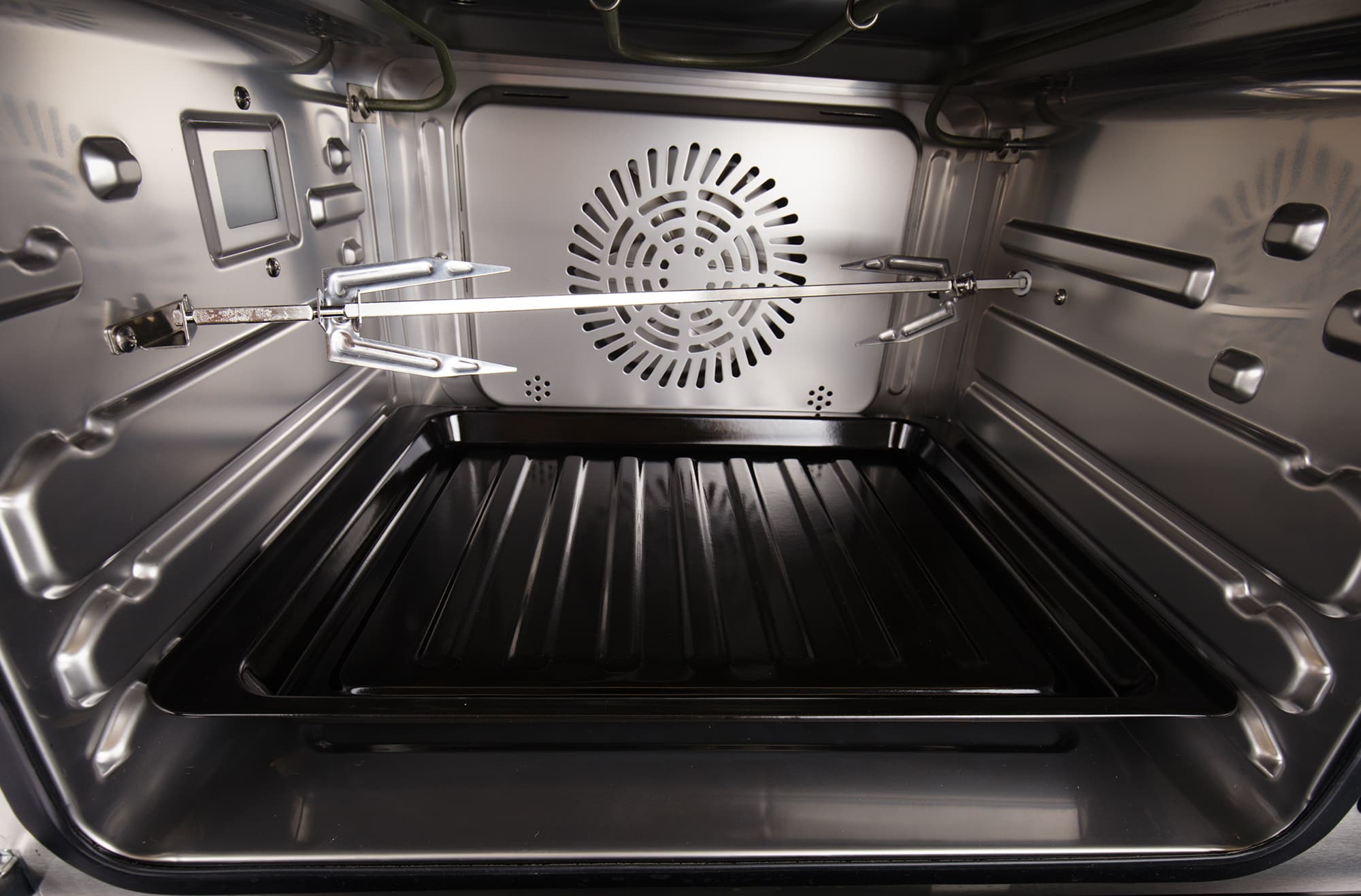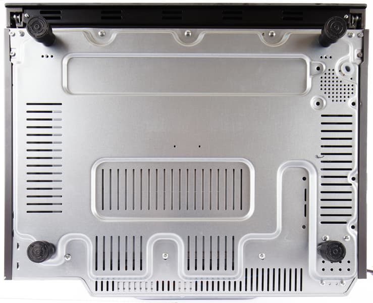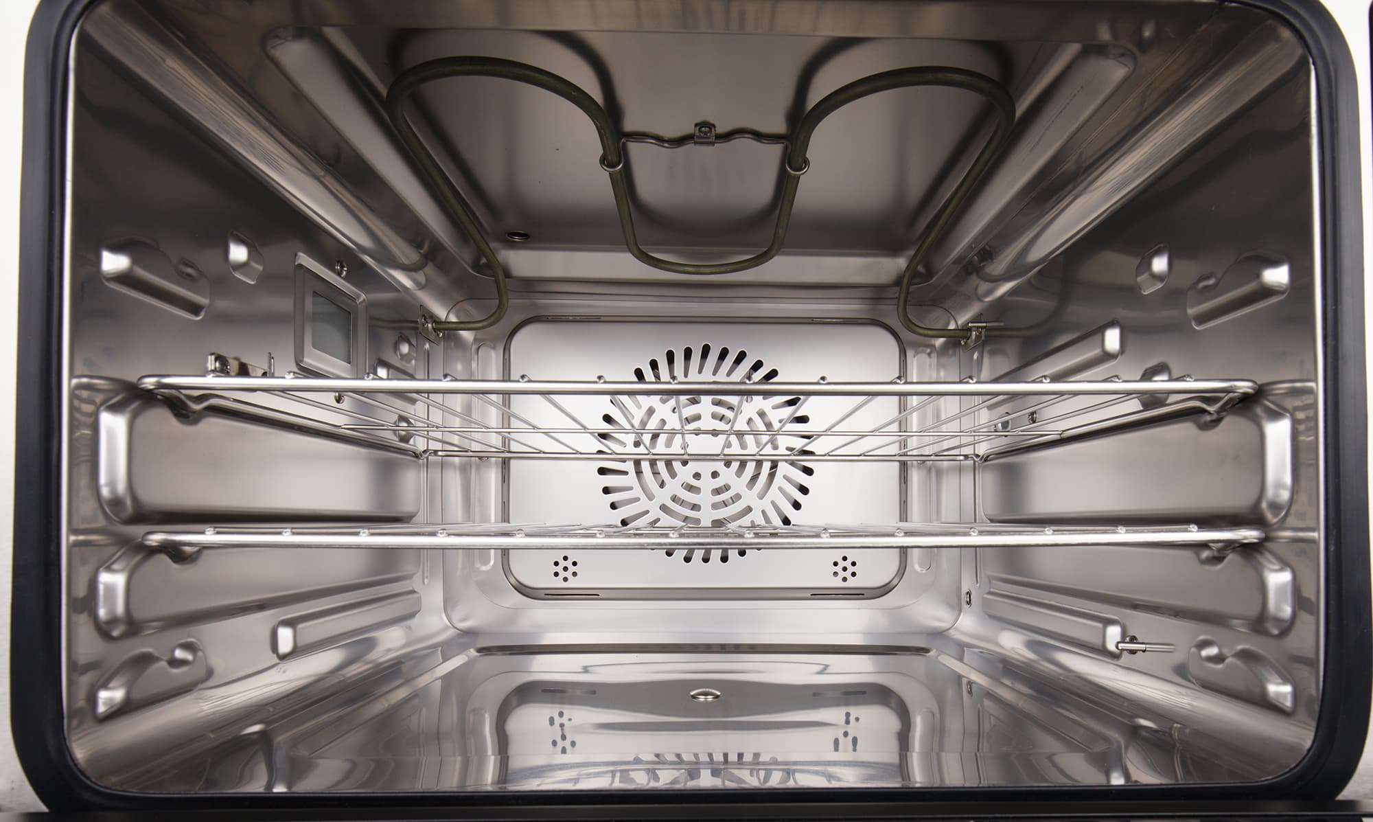 Дверца оборудована большой ручкой и двойным стеклом. Внутри камеры три элемента нагревания: сверху, снизу и сзади. Вентилятор расположен сзади по центру. Для решеток и поддона предусмотрено 4 уровня, вертел гриля вставляется в гнезда по диагонали.