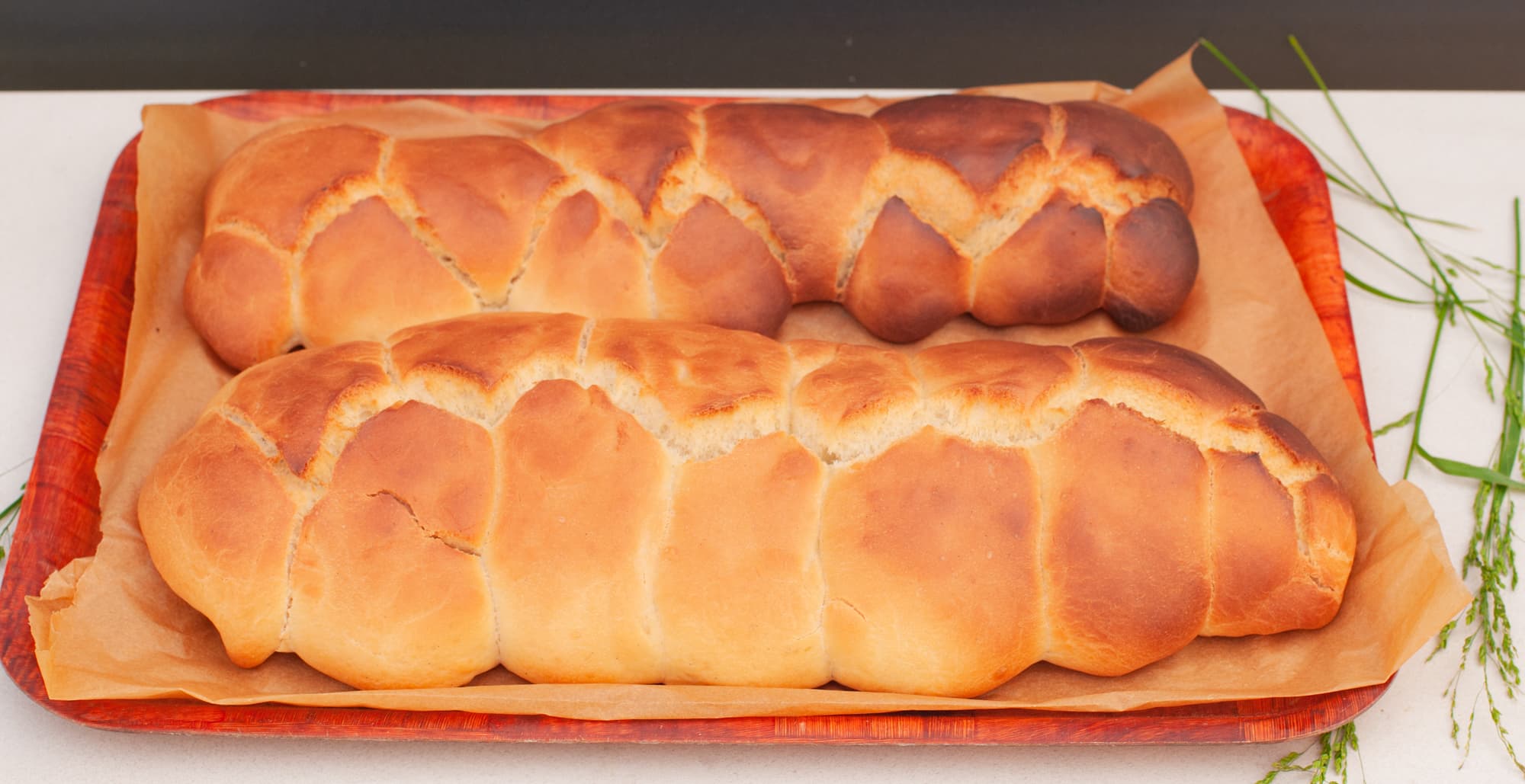 Для бриоши нам понадобилась мука, яйца, сливочное масло, сахар и дрожжи. Мы вымесили тесто с двумя расстойками, на решетку с бумагой для выпекания выложили небольшие кусочки теста, из которых после подъема теста сформировалось два батона.
