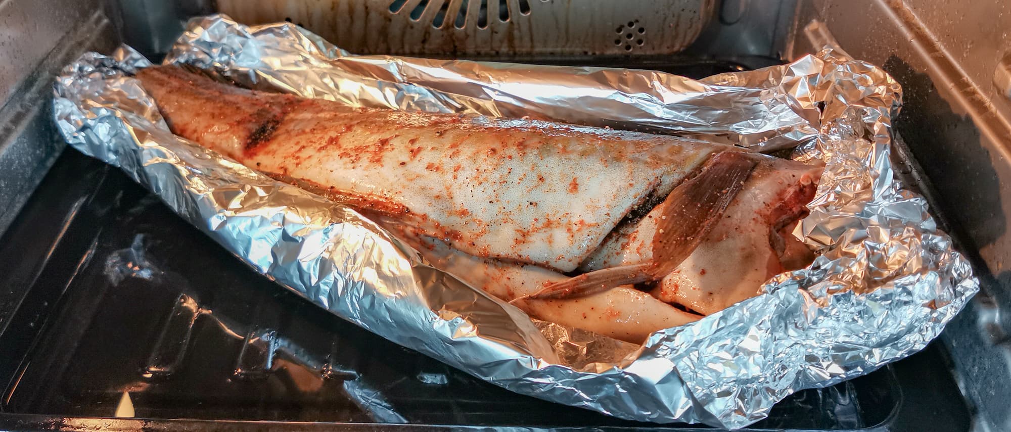 Натерли ее специями, подстелили на поддон фольгу, поставили на режим «на пару́» на 35 минут.