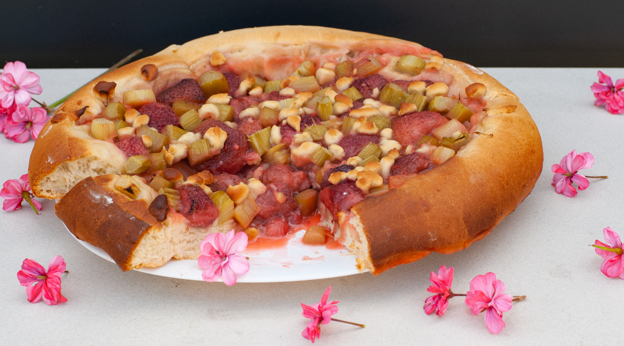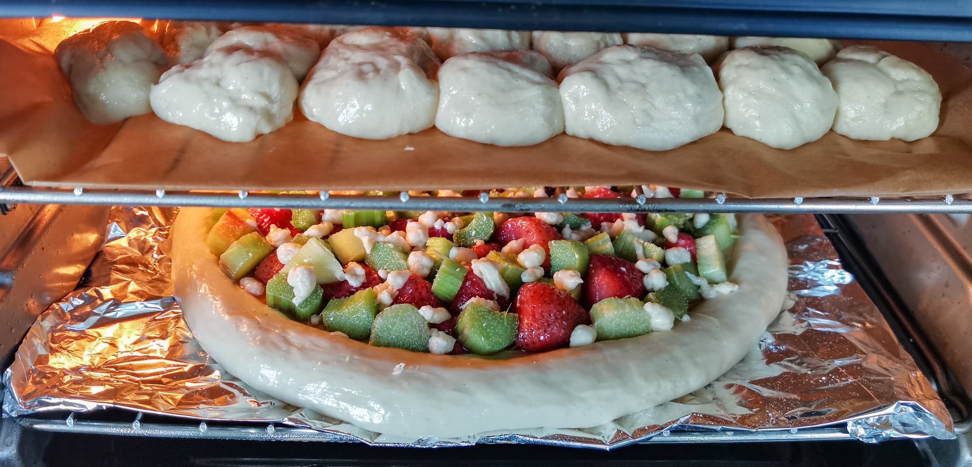Из дрожжевого сдобного теста мы сделали ватрушку с начинкой из свежего ревеня и клубники с сахаром. После расстойки поставили ватрушку на режим гриль с паром, на 200 °C и выпекали до готовности.