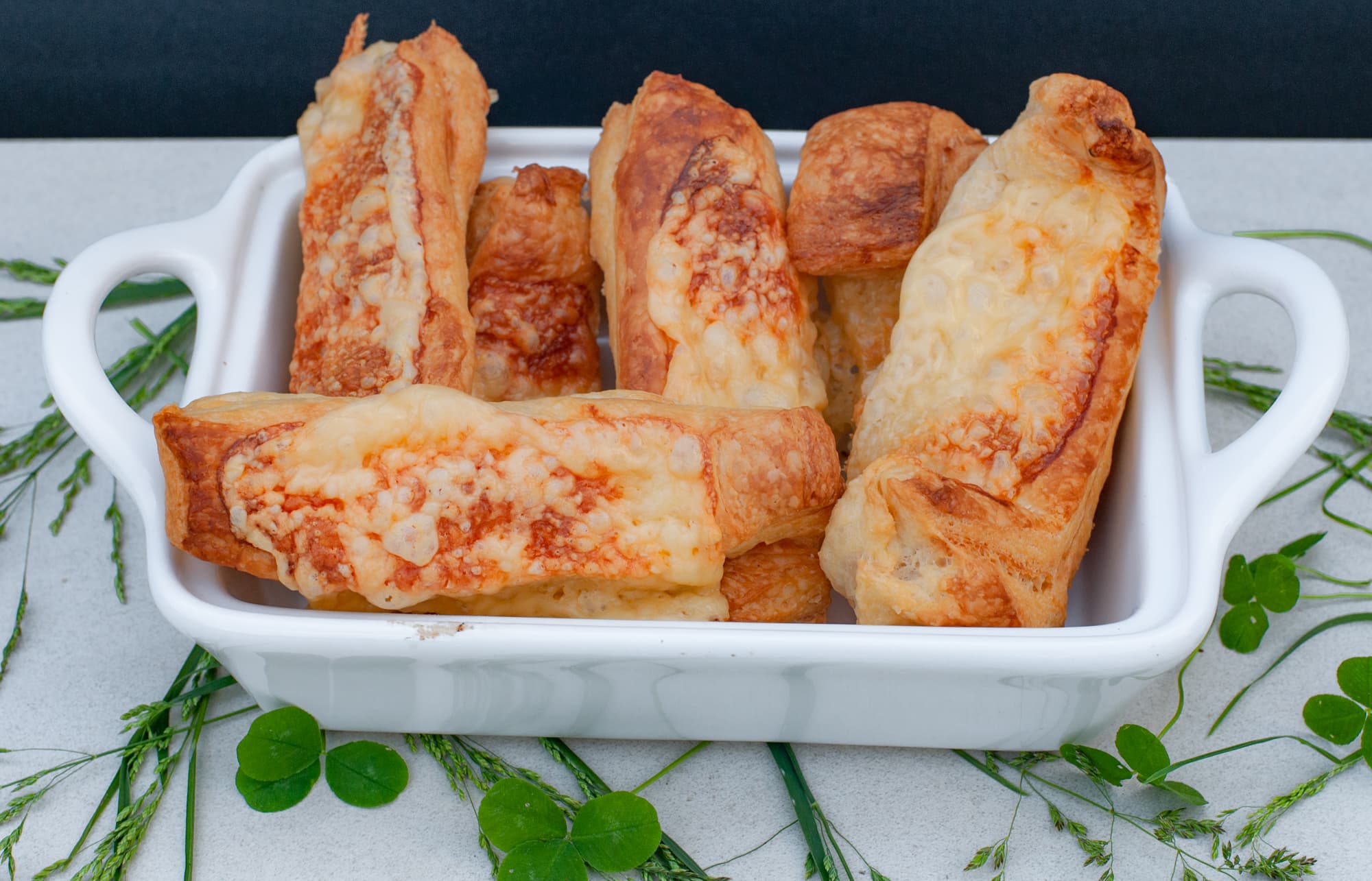 Мы взяли слоеное тесто, разрезали на полоски, положили сверху полоску сыра. Отправили на решетке, застеленной фольгой в мультипечь на режим F-26. Вынули по окончании программы.