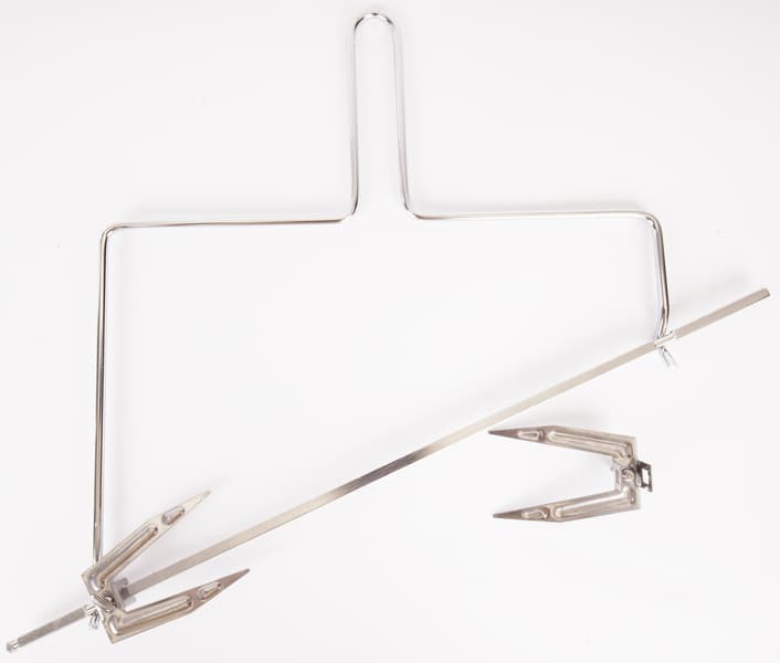 Вертел имеет съемные фиксаторы для надежного закрепления на нем курицы или мяса. Горячий вертел с продуктом можно снять с помощью рукоятки, входящей в комплект.
