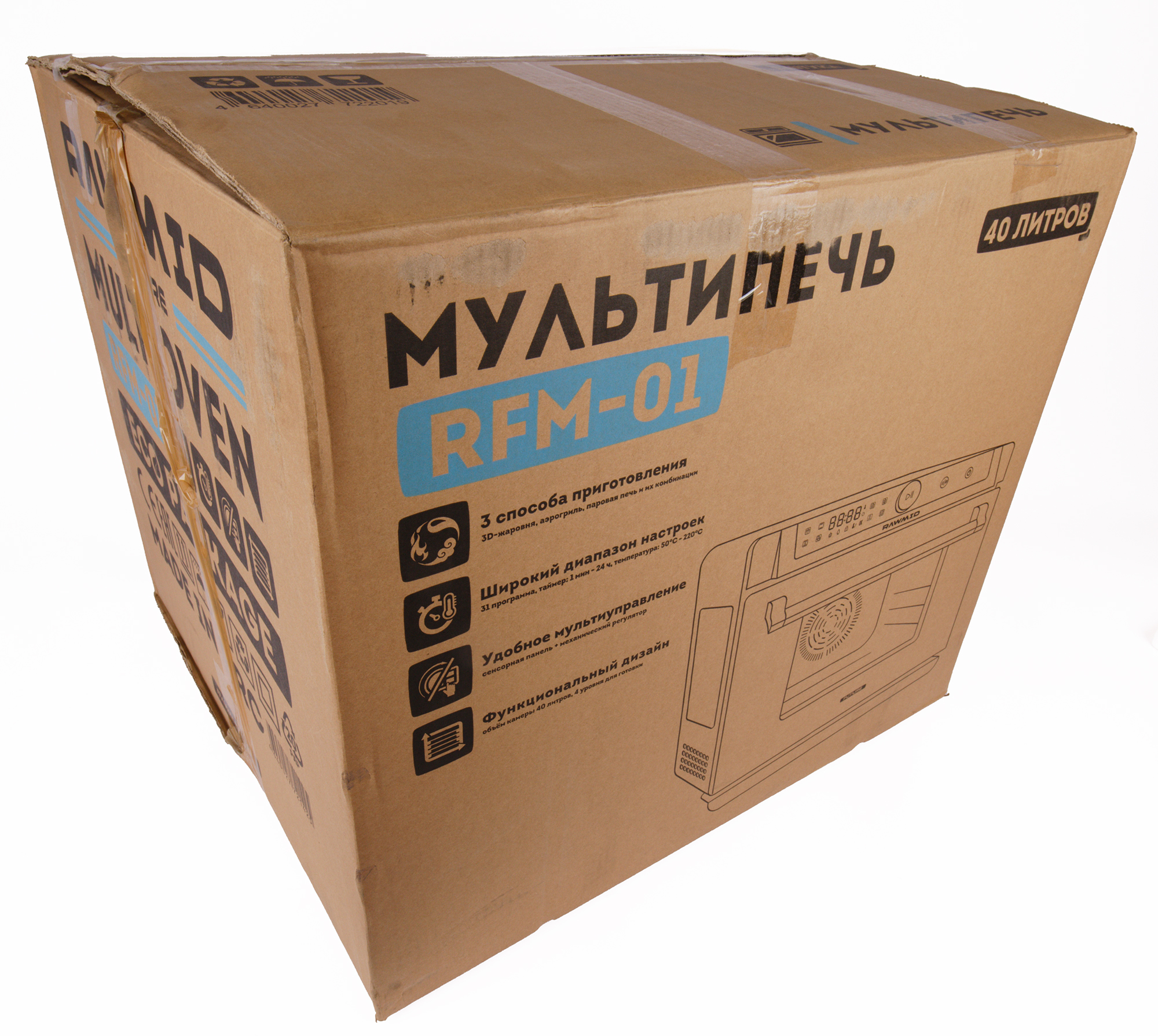 Мультипечь Rawmid Future RFM-01 пришла на тестирование в большой тяжелой коробке из технического картона без каких-либо ручек или прорезей для удобства манипуляций. В коробке находилась вторая защитная коробка с прибором, упакованным в пенопластовые вставки. На наружной коробке черным шрифтом проставлена техническая информация о приборе и служебные пиктограммы. Упаковка надежная, мультипечь плотно зафиксирована и защищена.