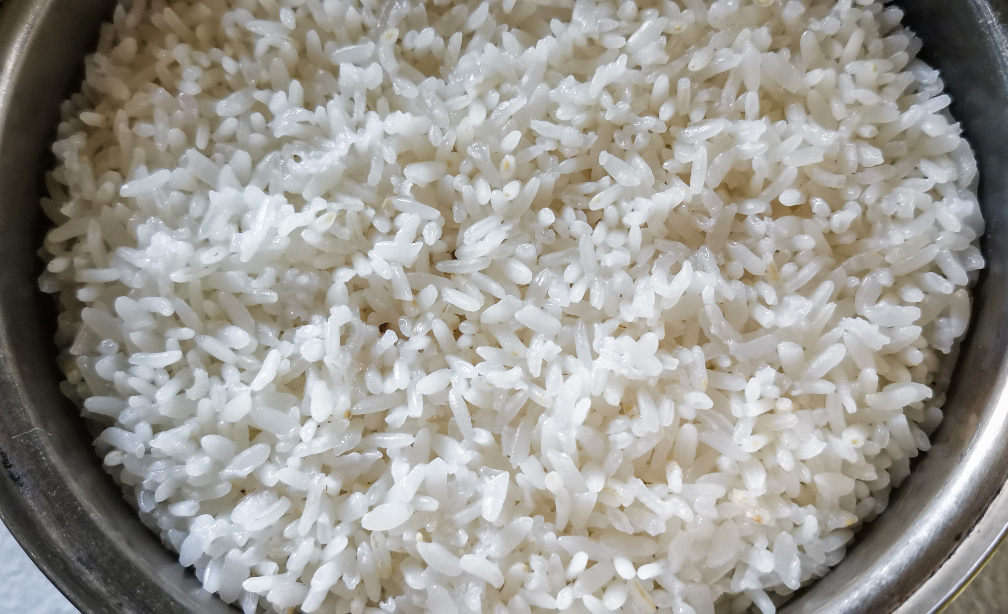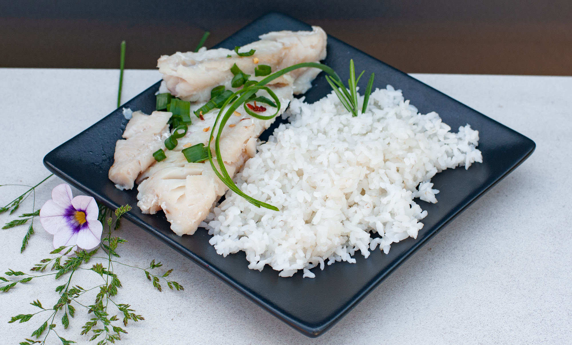 Как только прибор показал окончание работы, вынули рис, разложили по тарелкам, подали с паровой рыбой.