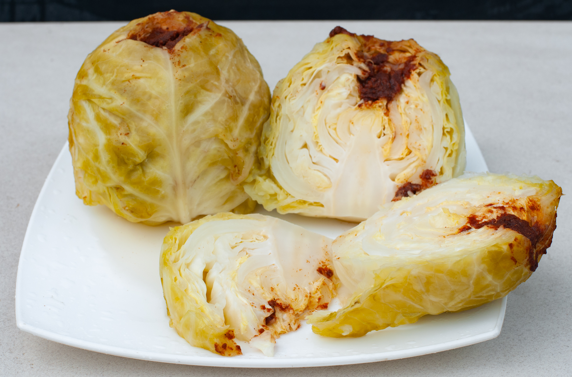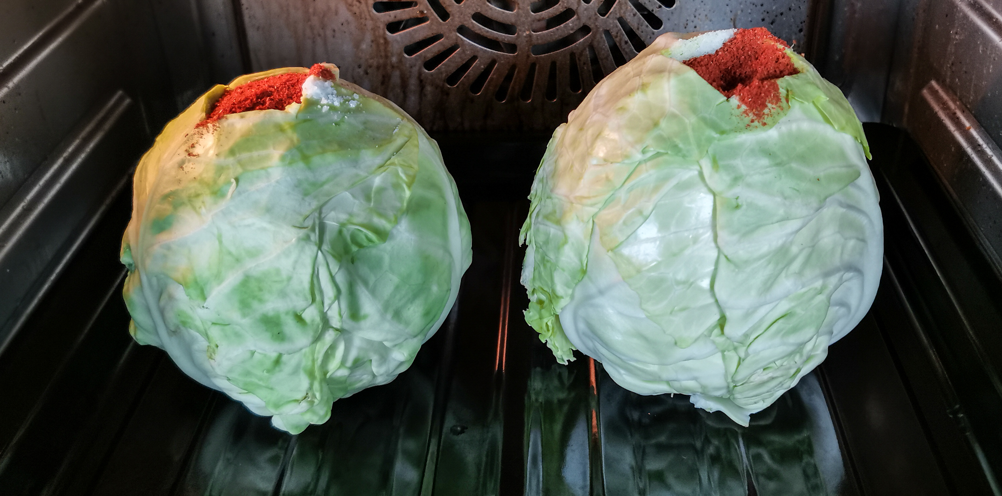 Мы взяли два кочана молодой капусты, вырезали сверху небольшое углубление, насыпали туда соль и паприку. Выставили программу «на пару́», поставили кочаны на поддон вниз. Готовили до мягкости, около 45 минут.