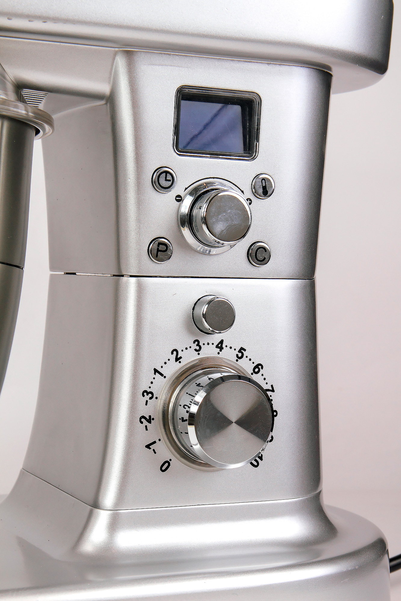 Как у всех «серьезных» планетарных миксеров корпус Rawmid RLM-05 довольно внушителен по габаритам и весу. Для этого прибора пользователю придется выделить место для эксплуатации и хранения. Вообще, и по размерам, и по функционалу прибор справедливо претендует на центральное место на кухне. Корпус выполнен из нержавеющей стали и пластика. Конструкция его стандартна: основание в левой части, где фиксируется дежа, откидная головка со шпинделем для установки насадок и двумя разъемами, закрытыми защитными крышками, для установки дополнительных насадок, панель управления с дисплеем, регуляторами и кнопками справа на фронтальной стороне.