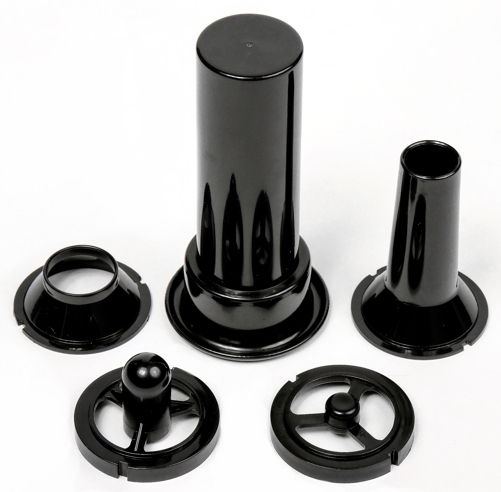 В комплект входит два барабана — для измельчения (крупной терки) и слайсер для тонкой нарезки. Металл прочный, не деформируется даже при сильном нажатии. Шлицевое соединение с приводным валом пластиковое.