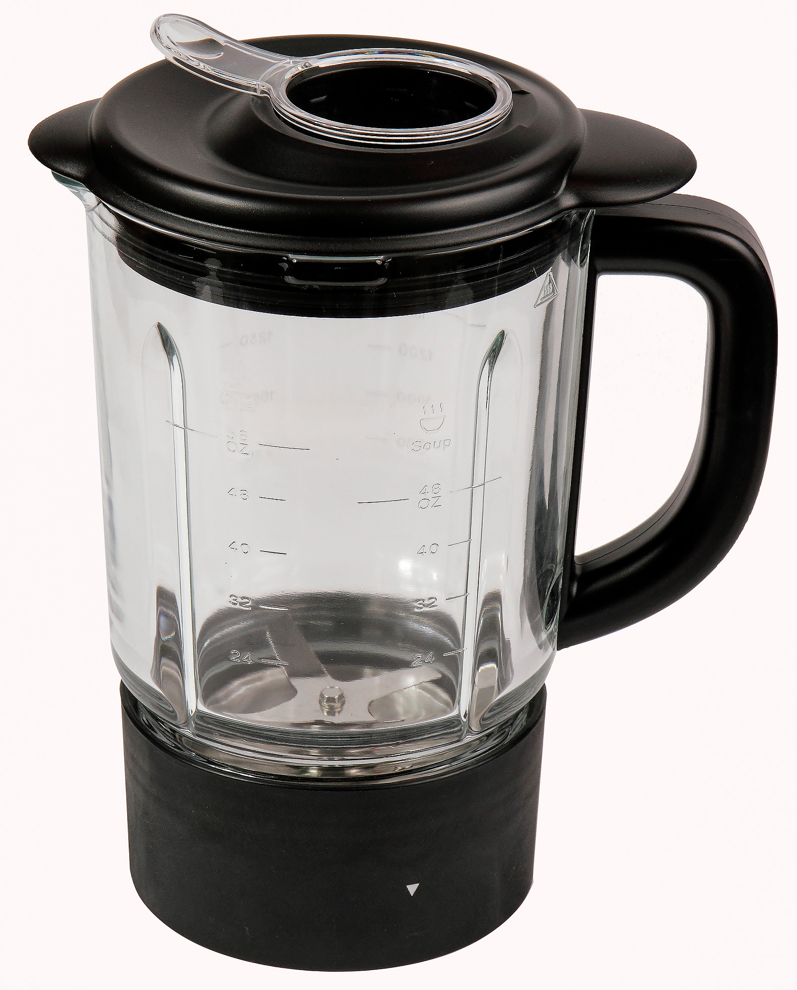 Стакан блендера изготовлен из толстого термостойкого стекла. Толщина стенок — 5 мм, что, разумеется, отразилось на весе аксессуара — больше двух килограммов. На стенках стакана нанесены отметки объема в унциях и мл. Примечательно, что на стакане отмечены две шкалы — для холодных продуктов и для супа. Носик облегчает слив готового продукта. На внутренней поверхности кувшина выделены четыре выступа, улучшающие смешивание продуктов.