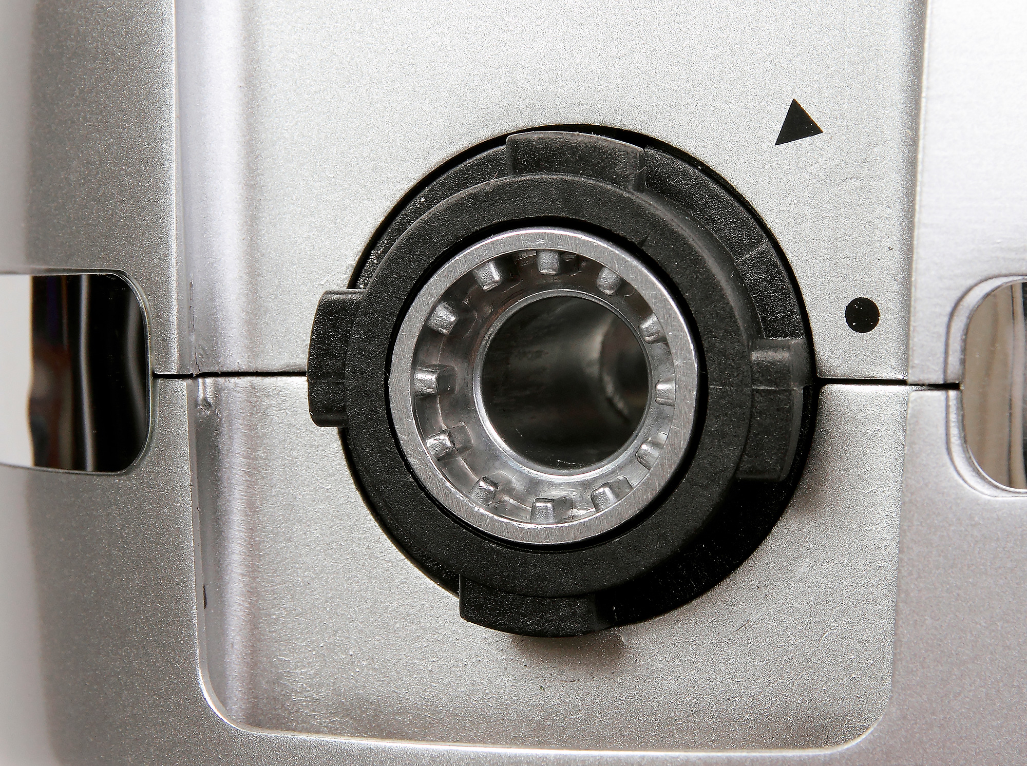 Корпус электрической терки изготовлен из прочного пластика черного цвета. Конструкция понятная с первого взгляда: внутрь корпуса вставляется металлический барабан, снаружи фиксируется пластиковым кольцом. На внешней стороне загрузочного отверстия и самом кольце имеются подсказки-метки места соединения этих деталей друг с другом. Загрузочное отверстие выполнено в форме трапеции. Размер его представляется нам вполне удобным и подходящим для переработки овощей, фруктов и других подходящих продуктов.