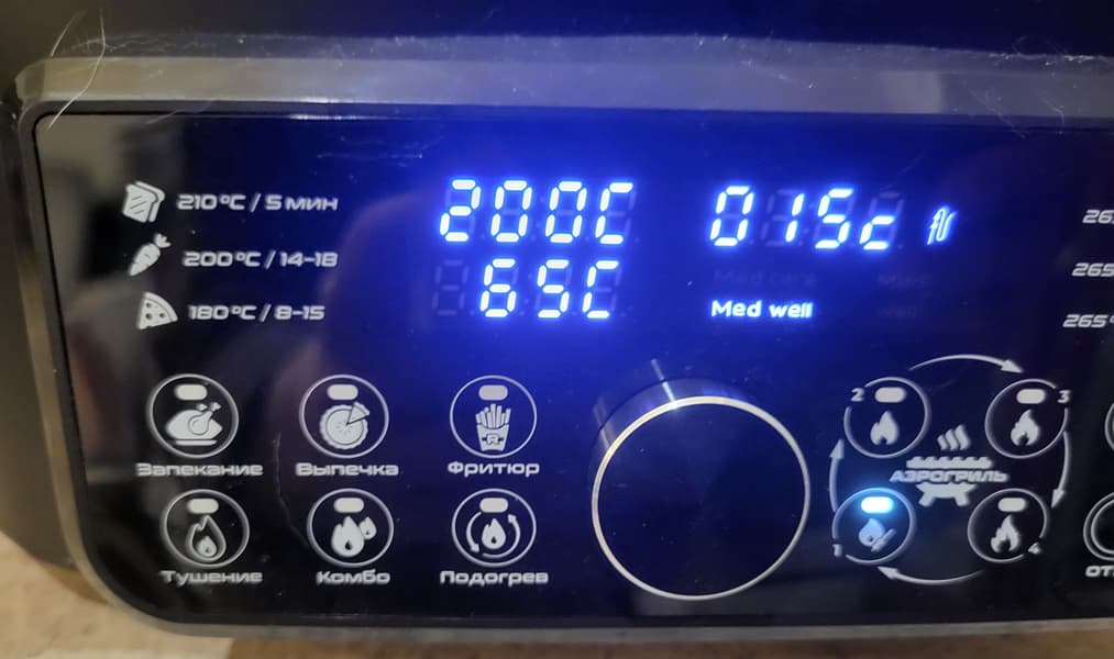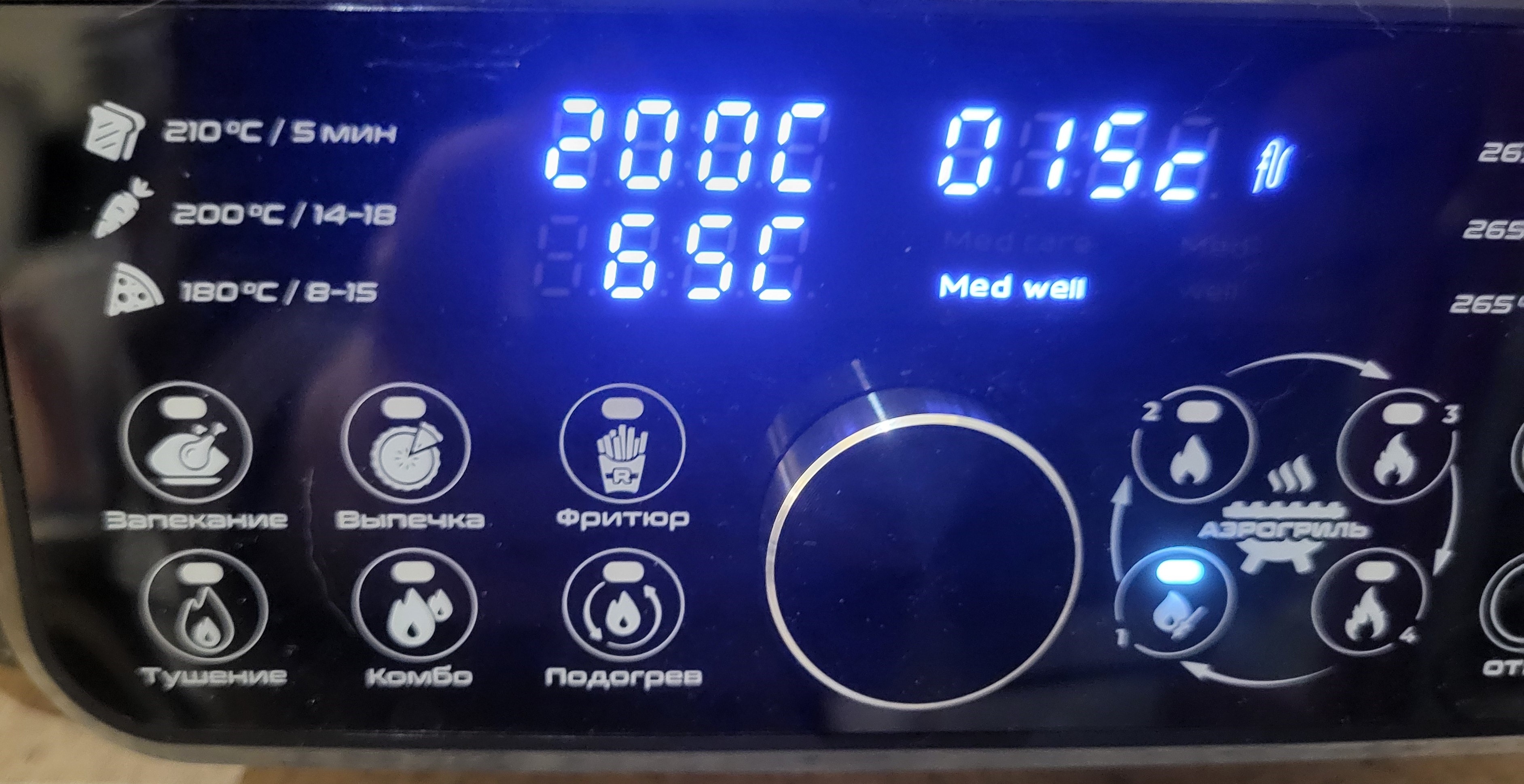 200 °C— это температура, до которой разогревается аэрогриль, 65 °C — это температура внутри куска мяса, которой мы хотим добиться, о чем также информирует и надпись Med well, а «015с» — это что? Горящий значок термощупа не вполне отвечает на этот вопрос. Может быть, это время в секундах, за которое приготовится мясо? Или же что-то другое?
