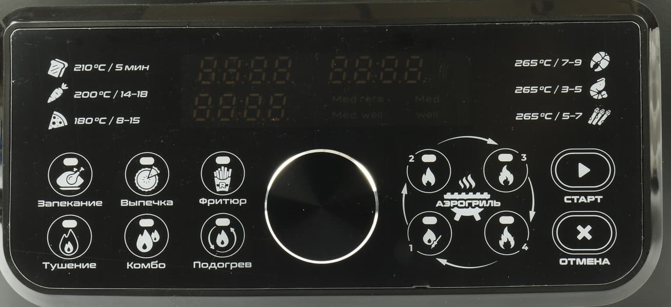 Справа от кнопок выбора режимов гриль-контроля находятся кнопка «старт», которой запускается работа аэрогриля, и кнопка «отмена», которой можно отменить любую программу.