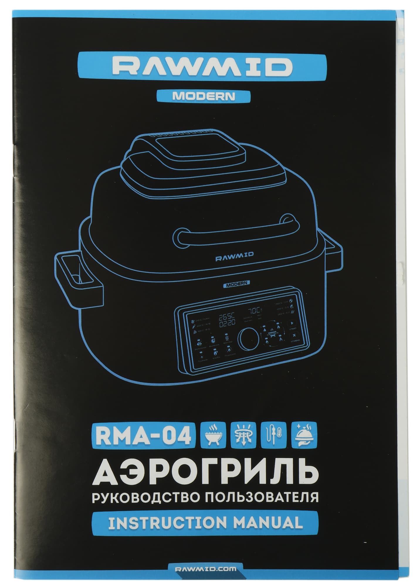 Инструкция к аэрогрилю Rawmid RMA-04 напечатана на 26 страницах формата А5 на плотной глянцевой бумаге. В ней описывается сам прибор, есть таблица с описанием режимов работы, возможных температур, времени и настроек по умолчанию. В другой таблице указаны параметры режимов работы с термощупом, а далее даются рекомендации по температуре, подходящей для разного типа продуктов. Традиционно в инструкции дается техническая информация, рассматривается устранение неполадок и проблем при готовке. Инструкция написана понятным и ясным языком, но хотелось бы более подробного описания работы с термощупом, поскольку в инструкции, увы, никак не указано, к какому конкретно месту в приборе его необходимо подключать, а рекомендации по температуре приготовления продуктов с термощупом даны только для стейков разной степени прожарки.