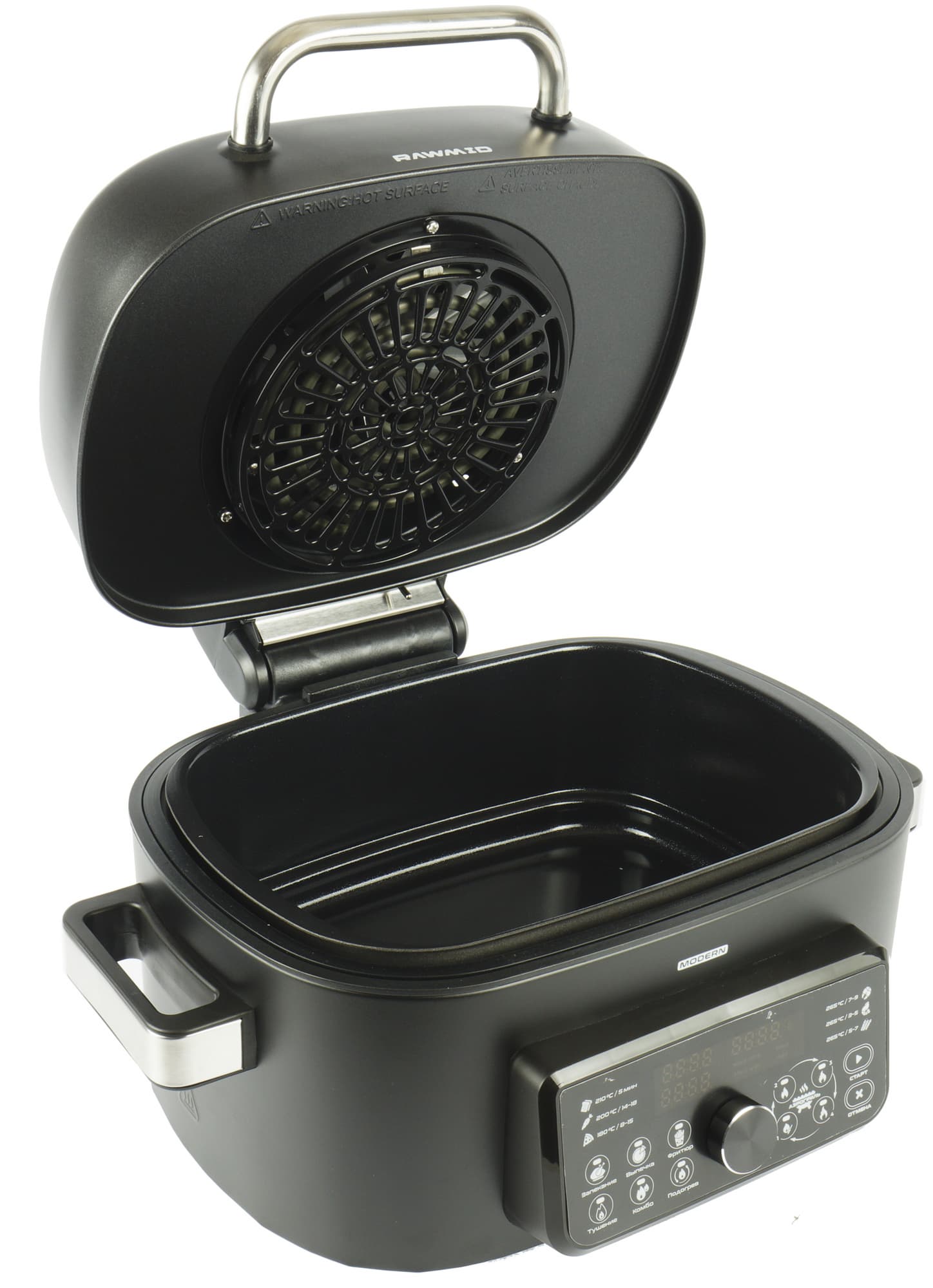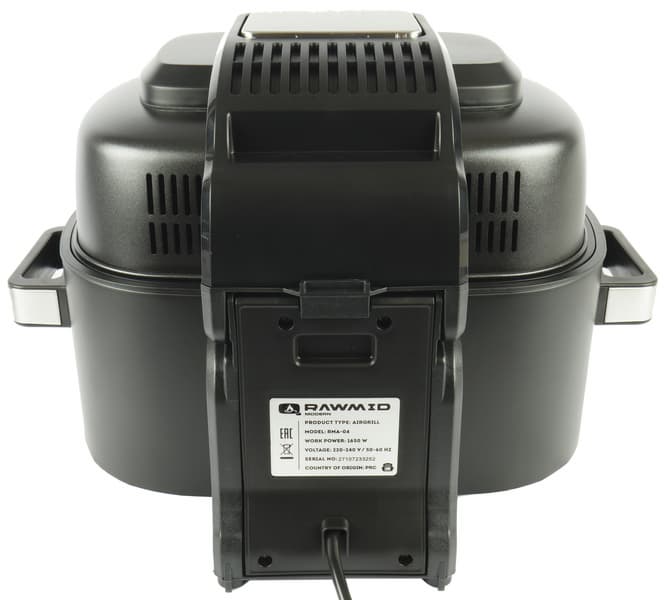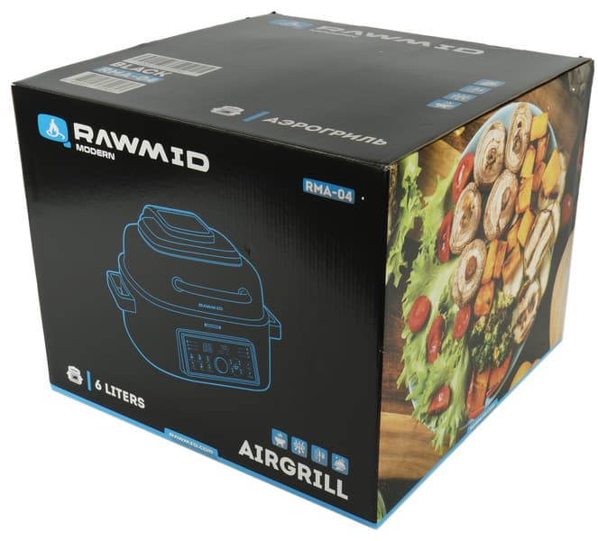 Аэрогриль Rawmid RMA-04 прибыл на тесты в большой коробке из технического картона, внутри которой обнаружилась еще одна коробка, оформленная в фирменном стиле Rawmid. На черном фоне мы видим прибор и указания его технических характеристик и возможностей, а также фотографию блюда, приготовленного в аэрогриле.