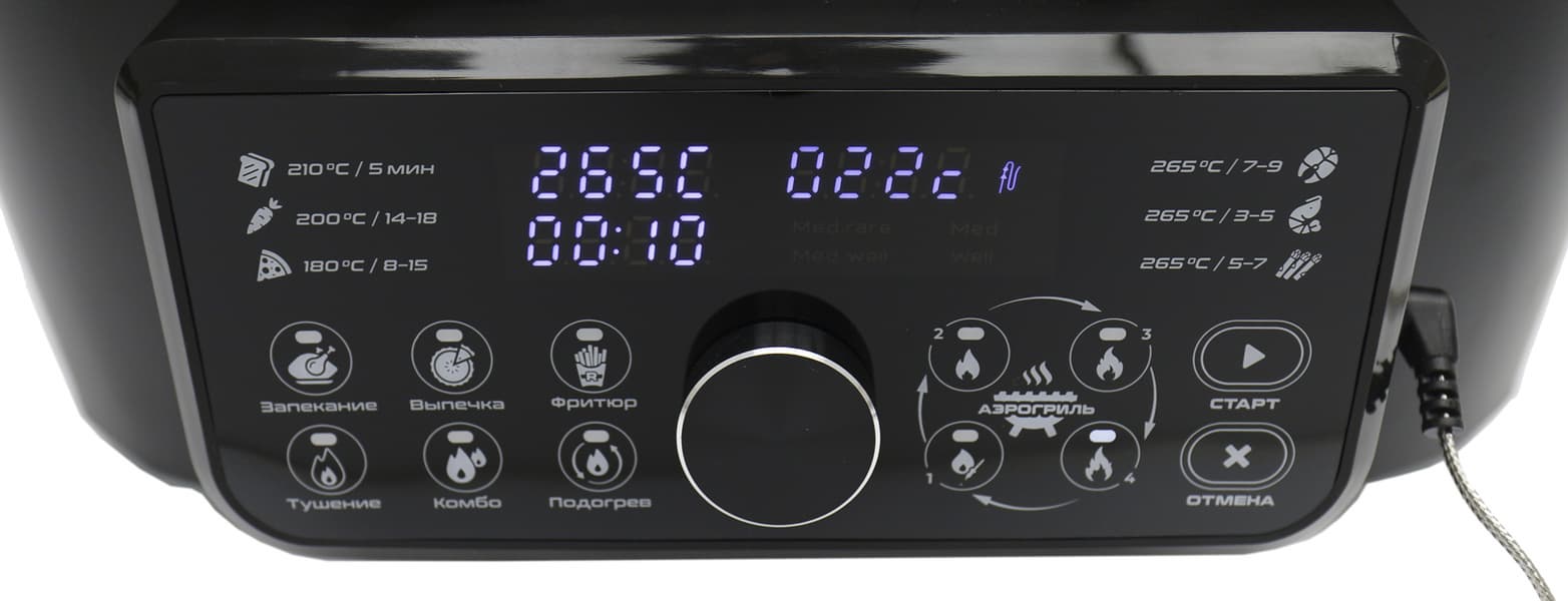 На фото ниже мы видим горящий дисплей и панель управления с подключенным термощупом. Верхнее значение «265C» — это температура, которой достигнет аэрогриль в процессе приготовления. 00:10 — значение времени приготовления, 10 минут. Цифры 022 показывают градусы по Цельсию, определяемые термощупом.