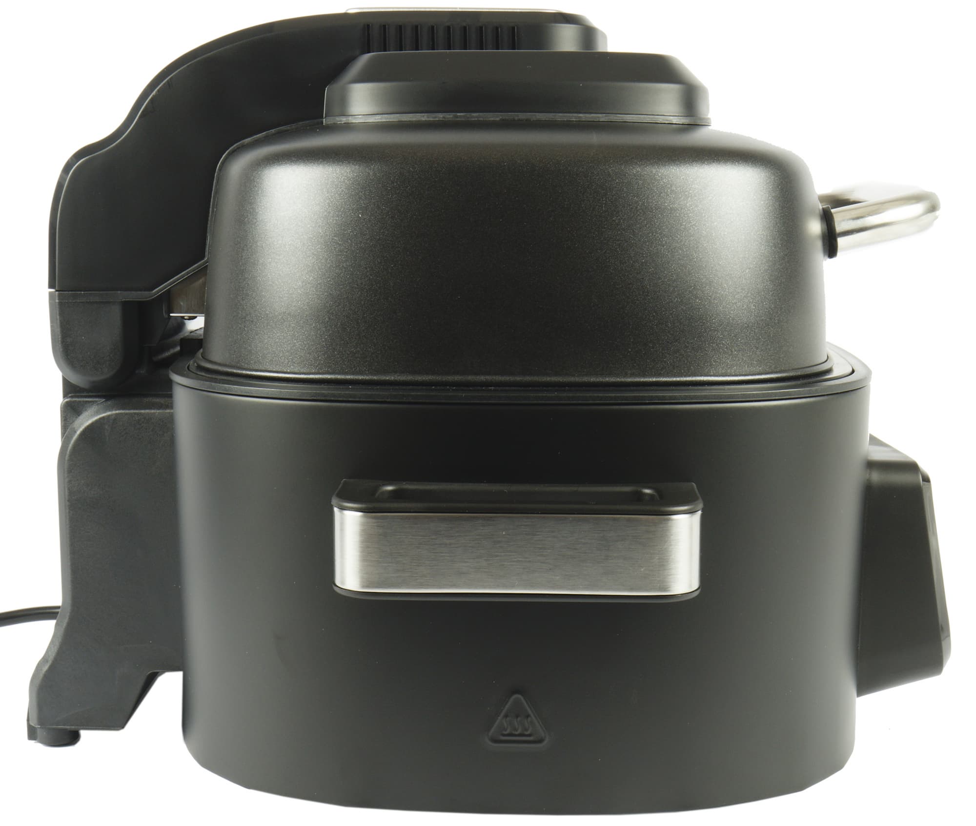 Вытащенный из коробки аэрогриль нам понравился. Черное немаркое покрытие, с которого легко стираются любые пятна, интересный дизайн. Крышка аэрогриля открывается вверх с помощью большой ручки, что представляется нам достаточно удобным.