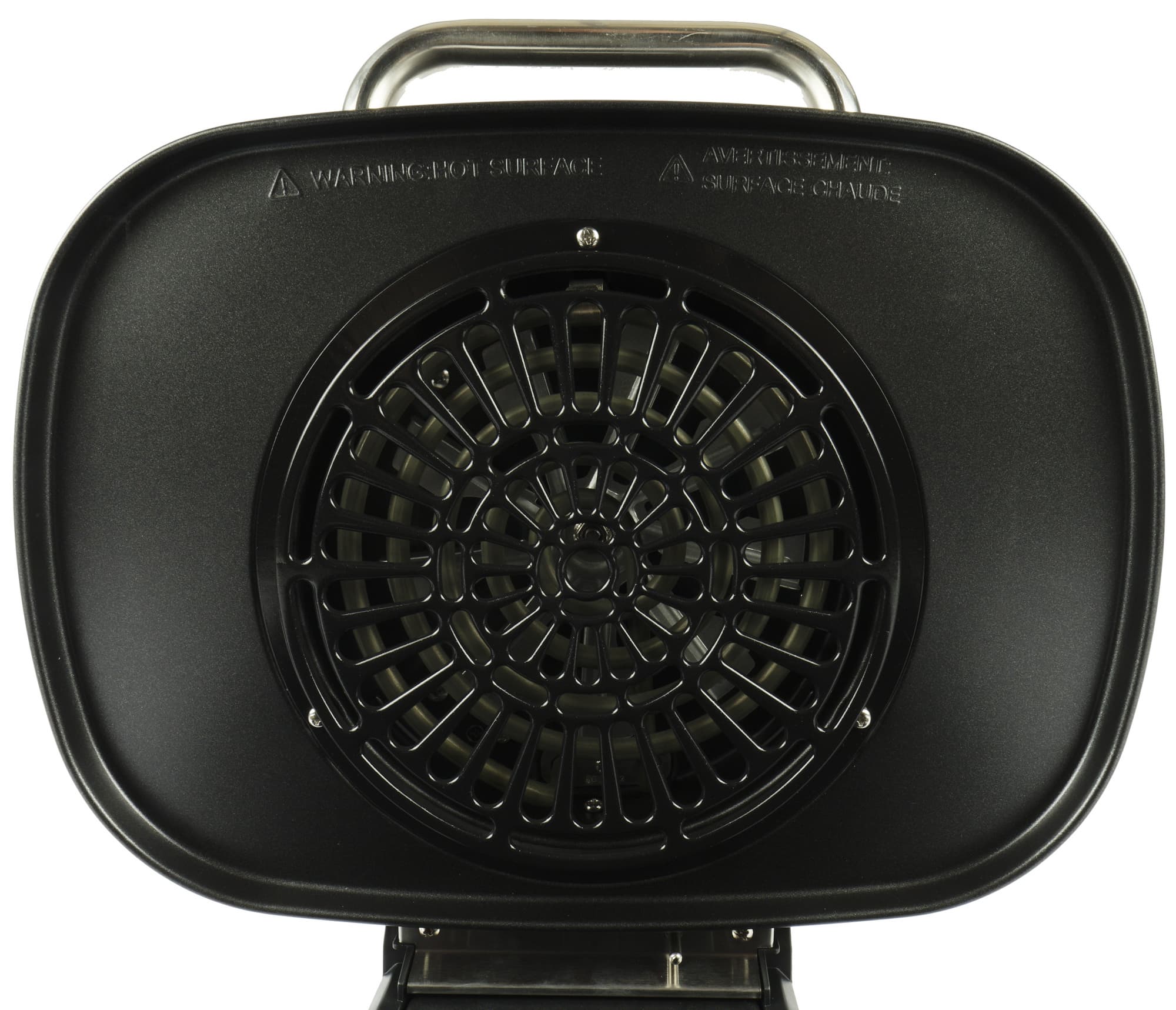 Нагревательный элемент находится в крышке прибора, и если увеличить фото, то можно увидеть, что он имеет спиралевидную форму, обеспечивающую, по утверждению производителя, широкий охват пространства и быстрый прогрев воздуха. Защитную решетку, защищающую нагревательный элемент от брызг, в случае необходимости можно снять и вымыть отдельно.