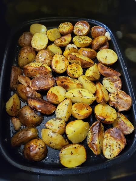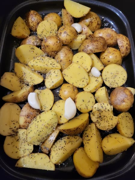 Через 18 минут мясо было готово, а картошка показалась нам еще сыроватой, поэтому мы решили дополнительно отправить ее в гриль на 10 минут на том же режиме. Вытащили продукты из гриля: мясо — потому что оно было готово, а картошку — потому что в этот раз мы не забыли про предварительный разогрев. Когда гриль разогрелся, вернули в него чашу с картофелем.