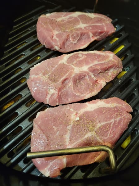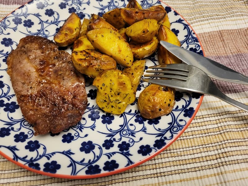 Следующим тестом мы решили проверить, как гриль готовит два блюда одновременно. Вниз, в чашу гриля, положили картошку, посыпали ее приправами и солью. На решетку гриля выложили свинину, тоже посыпав ее приправами, солью и перцем, и выставили 18 минут и 200 °C, для чего выбрали режим «гриль-контроль без термощупа», на 3 минуты скорректировав время приготовления.