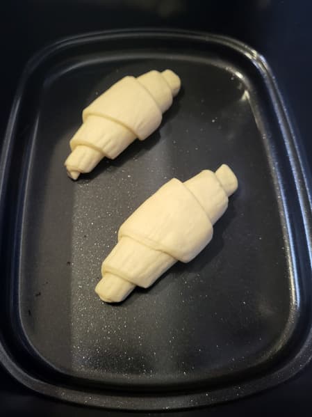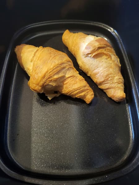 И в этот раз мы делали всё как обычно: достали замороженные круассаны из упаковки, дали им полежать 10 минут при комнатной температуре и отправили в аэрогриль точно по инструкции к круассанам: 165 °C и 20 минут.