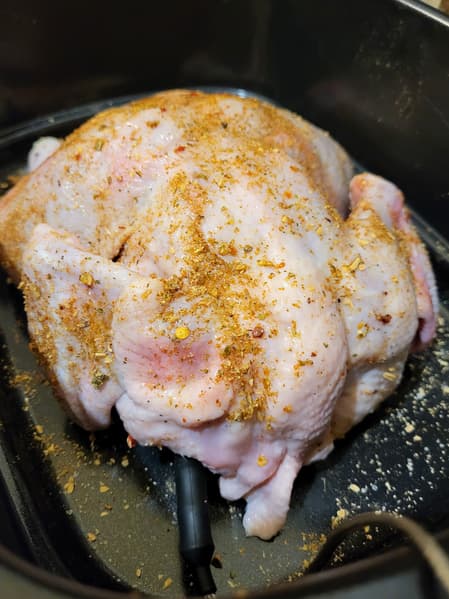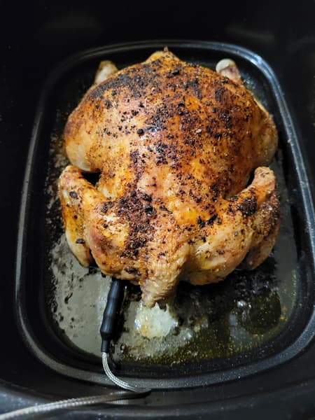 Курица весила 1412 г, и на ее приготовление при температуре 200 °C ушло 46 минут: по истечении этого времени термощуп показал 72 °C, а аэрогриль закончил работу.