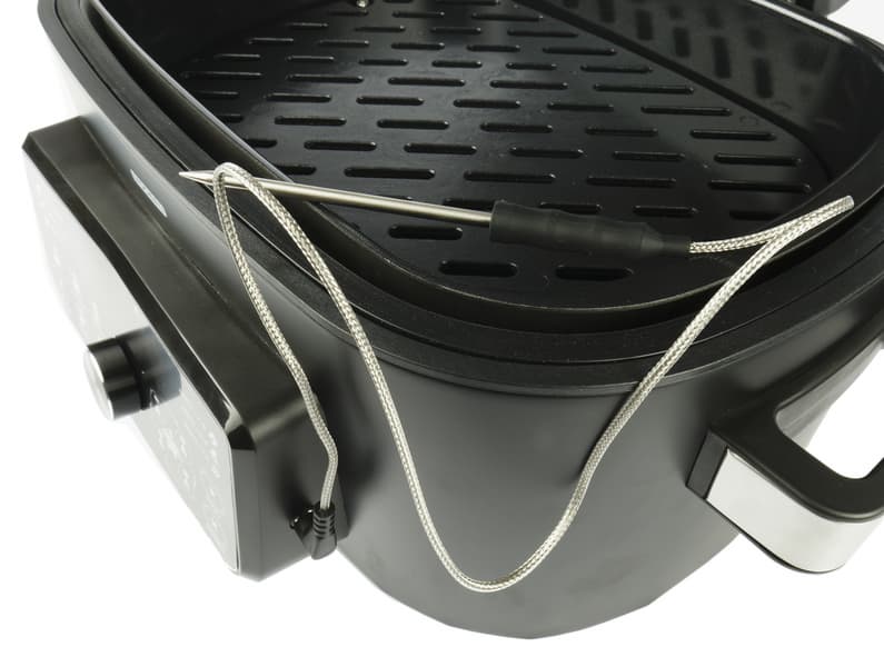 Как мы уже писали в разделе «Эксплуатация», термощуп вставляется одним концом в панель управления (маленькое отверстие справа), а вторым концом, собственно термощупом — в кусок мяса, при этом желательно выбрать наиболее толстую часть. Провод термощупа достаточно тонкий, и крышка аэрогриля закрывается без проблем.