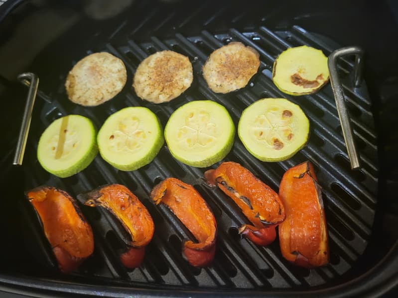 Первое, на чем мы решили протестировать аэрогриль — это овощи. Взяли кабачки, баклажаны и сладкий перец, порезали на кусочки и отправили в гриль на 7 минут на 265 °C, следуя рекомендациям на панели управления гриля (изображение спаржи, где указана температура и время 5-7 минут). Для приготовления выбрали режим «аэрогриль», мощность 4.