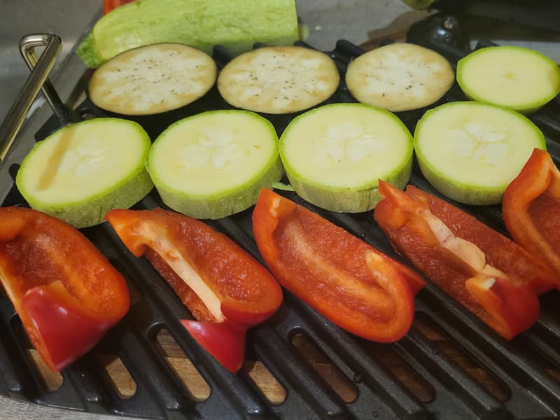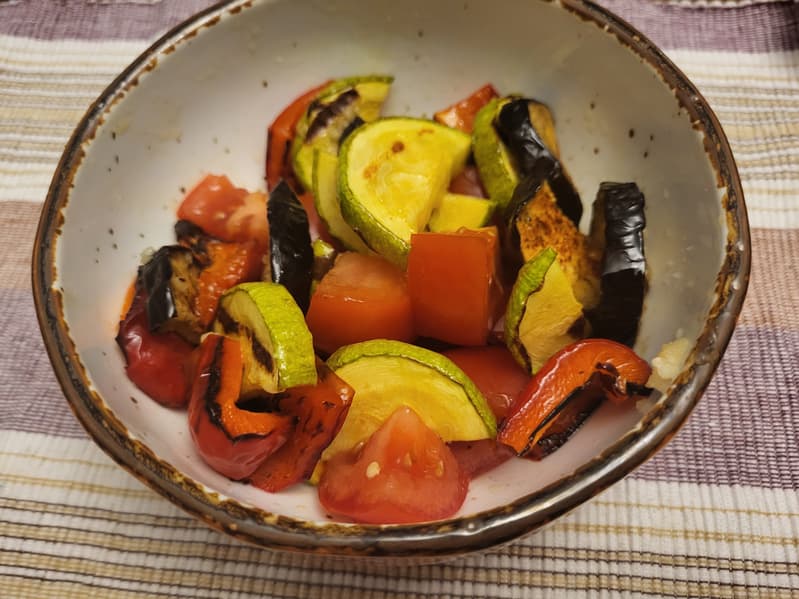 Вынули овощи из гриля и приготовили теплый салат, залив их соусом — лимонный сок, оливковое масло, немного соли и перца.