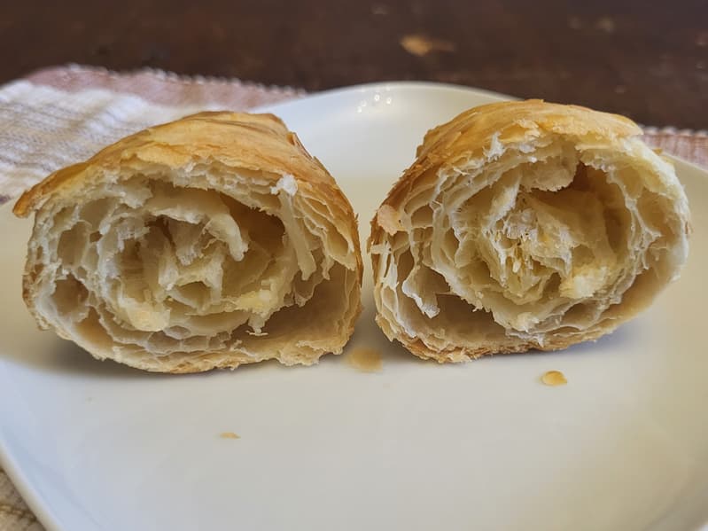 Круассаны получились идеальными. В них пропеклось всё, и даже середина была ровно такой, как нужно: слоистая, с видимыми чередующимися слоями теста, пропеченная, не влажная ни на ощупь, ни на взгляд.