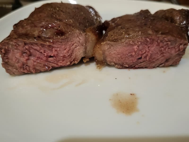 На фото слева мы видим стейк в начале приготовления, а на фото справа — уже готовый стейк.