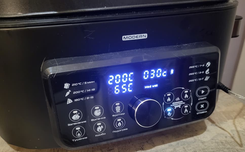 И уже в процессе приготовления догадались, что эта сначала нераспознанная нами надпись показывает ту температуру, которую фиксирует термощуп. Как видно на фото ниже, через некоторое время приготовления температура внутри куска мяса достигла 30 °C, а по достижении 65 °C аэрогриль отключился.