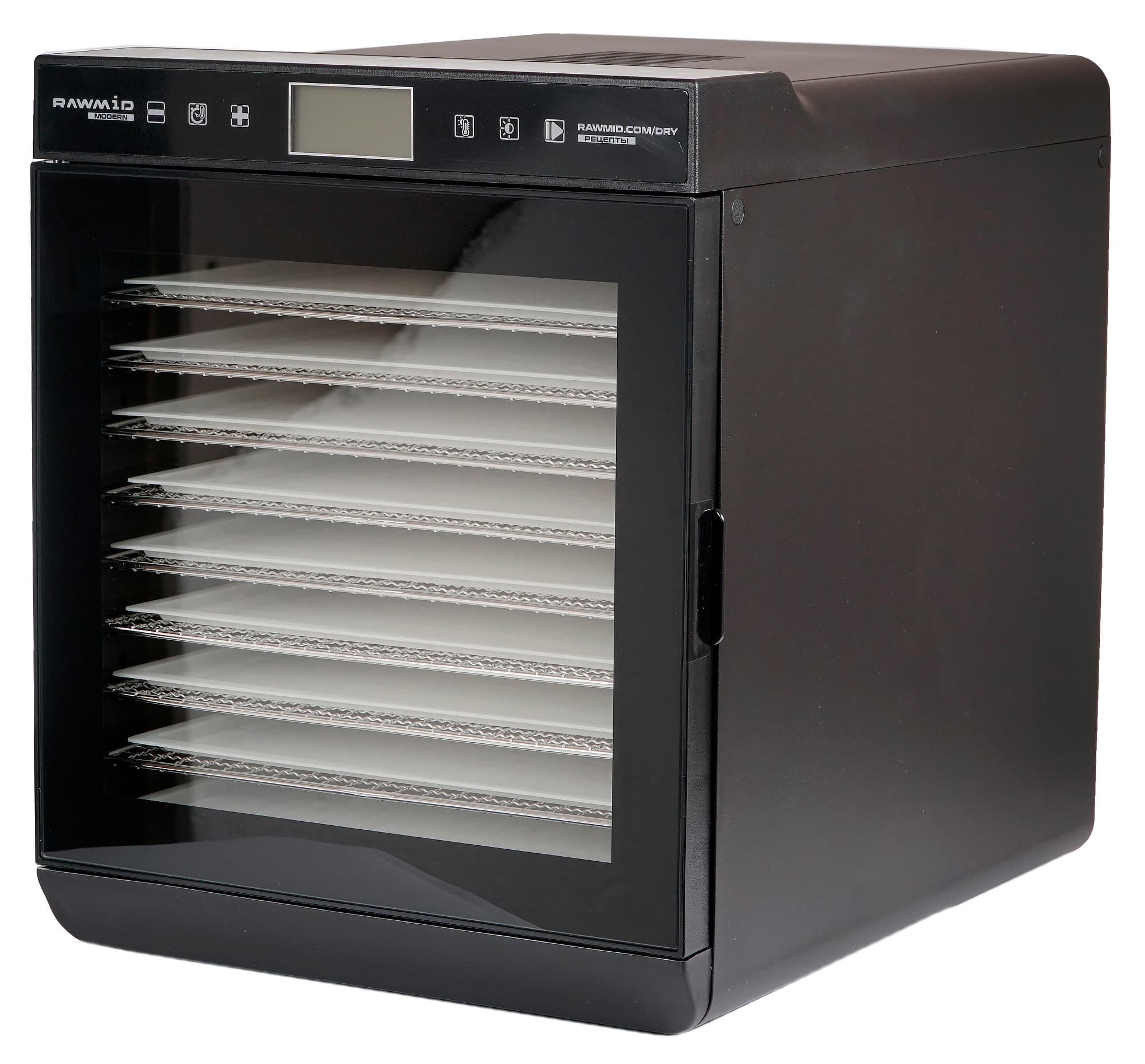 Внешне дегидратор Rawmid Modern RMD-10 представляет собой параллелепипед черного цвета. Такая форма кажется нам наиболее удачной, позволяющей сэкономить пространство и увеличить полезную площадь для сушки продуктов. Попавший на тесты прибор выполнен в черном цвете. Также можно приобрести дегидратор белого цвета. Боковые стороны имеют ровную поверхность. Матовый пластик не выглядит дешевым.