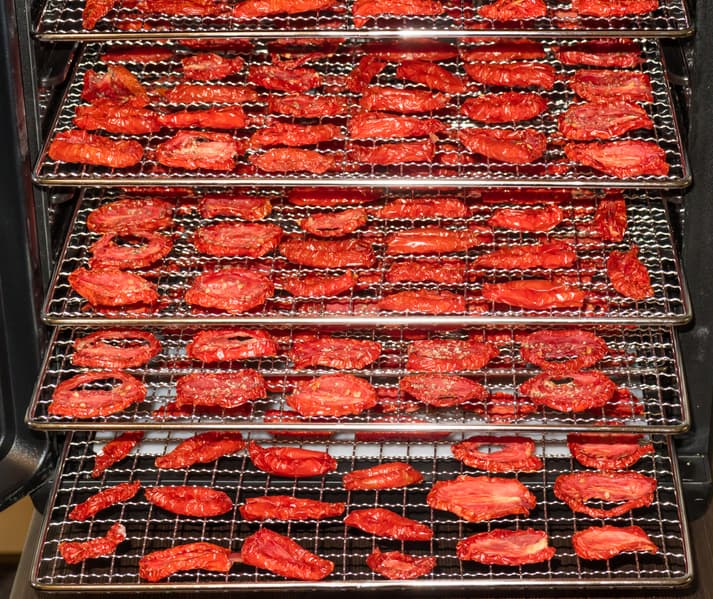 На один лоток помещались томаты весом около 570 г. Оговоримся, что данная цифра приблизительная и может изменяться в зависимости и от способа нарезки, и от степени влажности плодов, и даже от того, как пользователь разложит кусочки на поддоне. Всего заполнили 6 рядов. Начальный вес сырья составил 5 килограммов ровно. Таким образом, в полностью загруженном дегидраторе можно высушить за одну итерацию более 8 кг помидоров. Отличная вместительность.