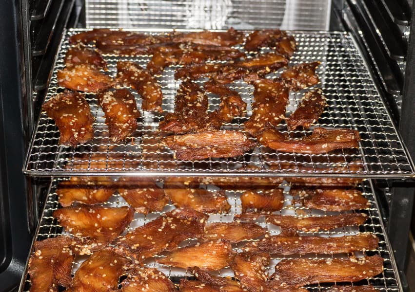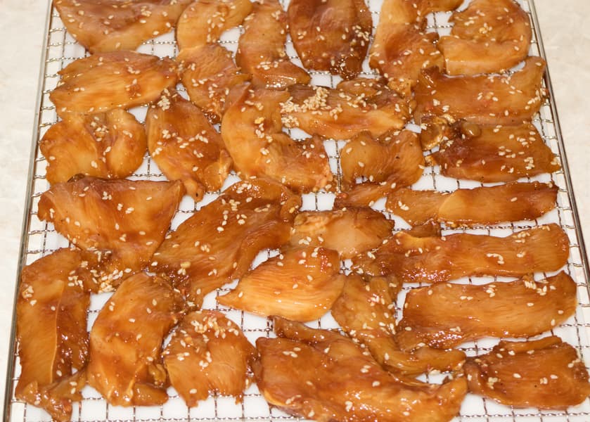 На следующее утро разложили кусочки курицы в один слой на металлические поддоны. На двух лотках поместилось почти 1,1 кг куриного филе. Разместили их в центральной части сушильной камеры.