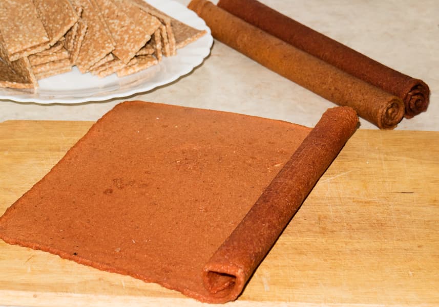 Сушили вместе с двумя поддонами льняных хлебцев в течение шести часов на 50 °C. Через три часа после начала перевернули листы пастилы и выложили их на металлические сетки. Через пять часов пастила была достаточно, на наш вкус просохшей. Для хранения такая степень не подойдет, а вот для употребления в течение скольких дней, вполне. Пастила гибкая, ароматная. Прекрасно употребляется в качестве основы для бутербродов или для приготовления роллов со свежими овощами и зеленью. Да и сама по себе овощная пастила весьма любопытная закуска.