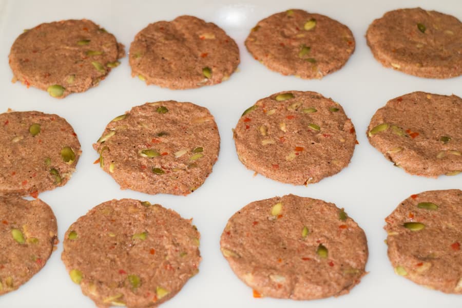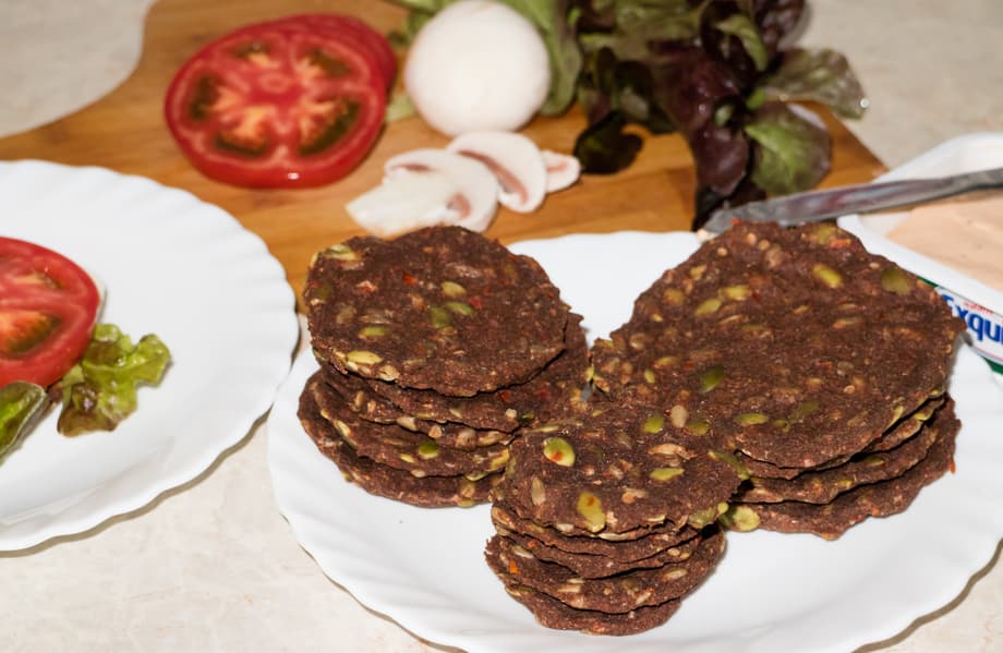 Измельчили в блендере несколько томатов, кабачок, луковицу и пару зубчиков чеснока, добавили немного воды, соли, перца и специй. Выложили овощную смесь в миску и добавили измельченное льняное семя, семена подсолнечника и тыквенные семечки. Тесто получилось мягкое и липнущее к рукам. Поэтому при работе с ним смачивали ладони холодной водой. Расплющили кусочек на столе и вырезали небольшие и средних размеров лепешки. Выкладывали их на смазанный растительным маслом сплошной поддон.