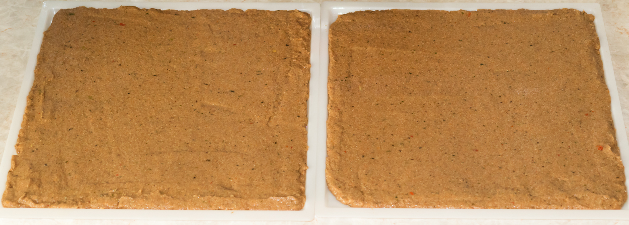 Смазали сплошные поддоны растительным маслом и разложили полученную овощную пасту. Нам понадобилось два листа.