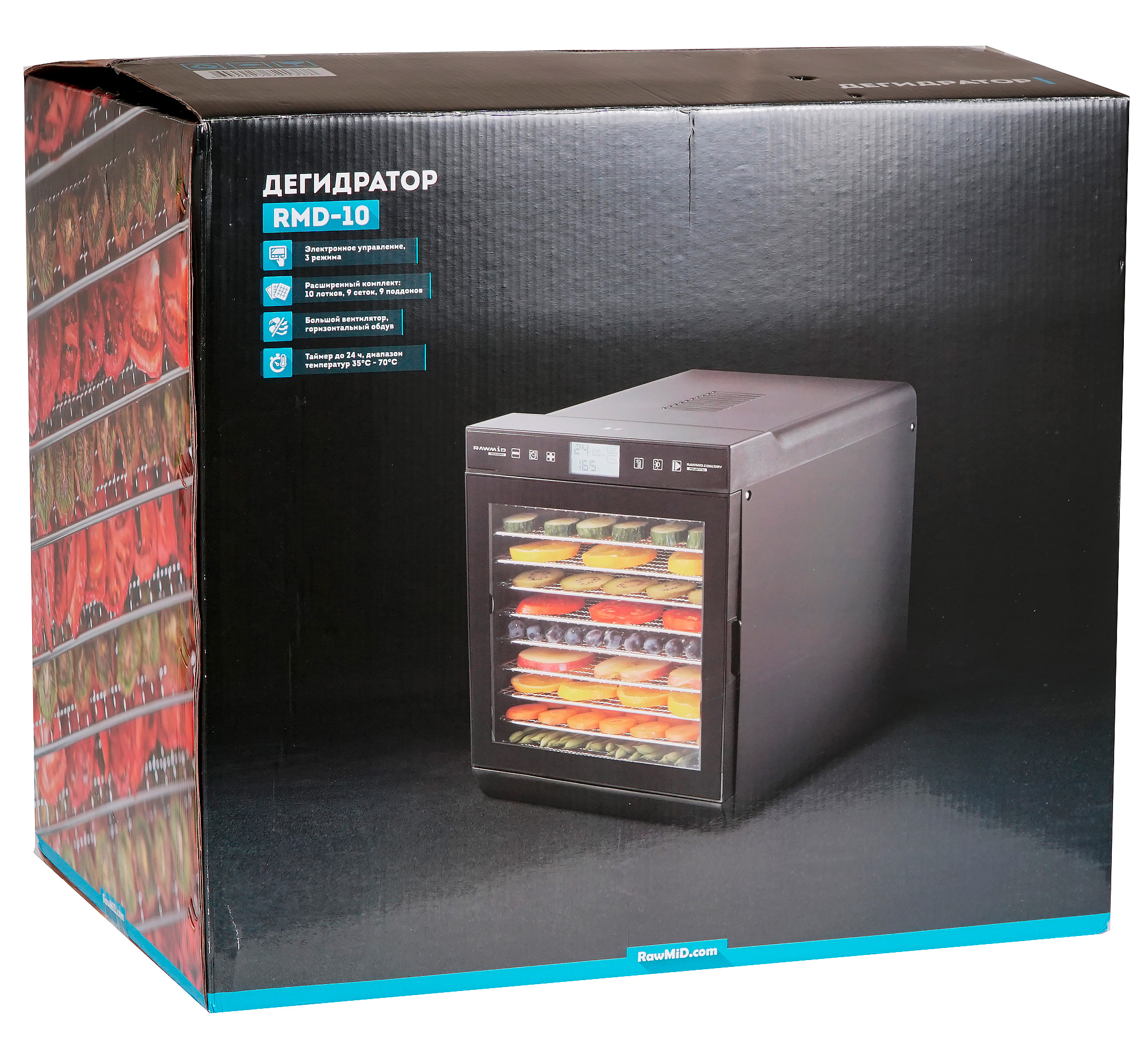 По большинству параметров и характеристик данный дегидратор схож с другими приборами этого же производителя. Основное отличие, помимо высокой мощности — это наличие двух автоматических режимов — низкотемпературной и высокотемпературной сушки и функции поддержания тепла. В соответствующих разделах обзора мы подробно опишем данные особенности Rawmid Modern RMD-10.
