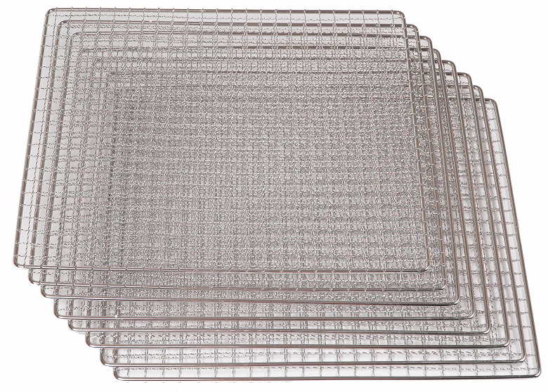 В комплект к дегидратору входят 10 металлических лотков с размером ячеек 11×11 мм, 9 пластиковых решеток с ячейкой 4×4 мм и 9 сплошных поддонов с бортиками высотой 5 мм. Лотки изготовлены из нержавеющей стали и предназначены для сушки цельных или крупно нарезанных продуктов.