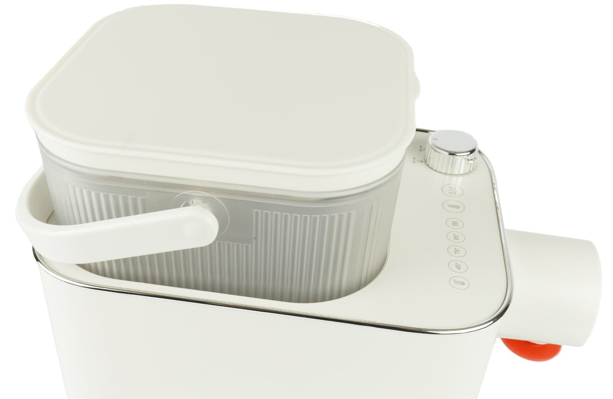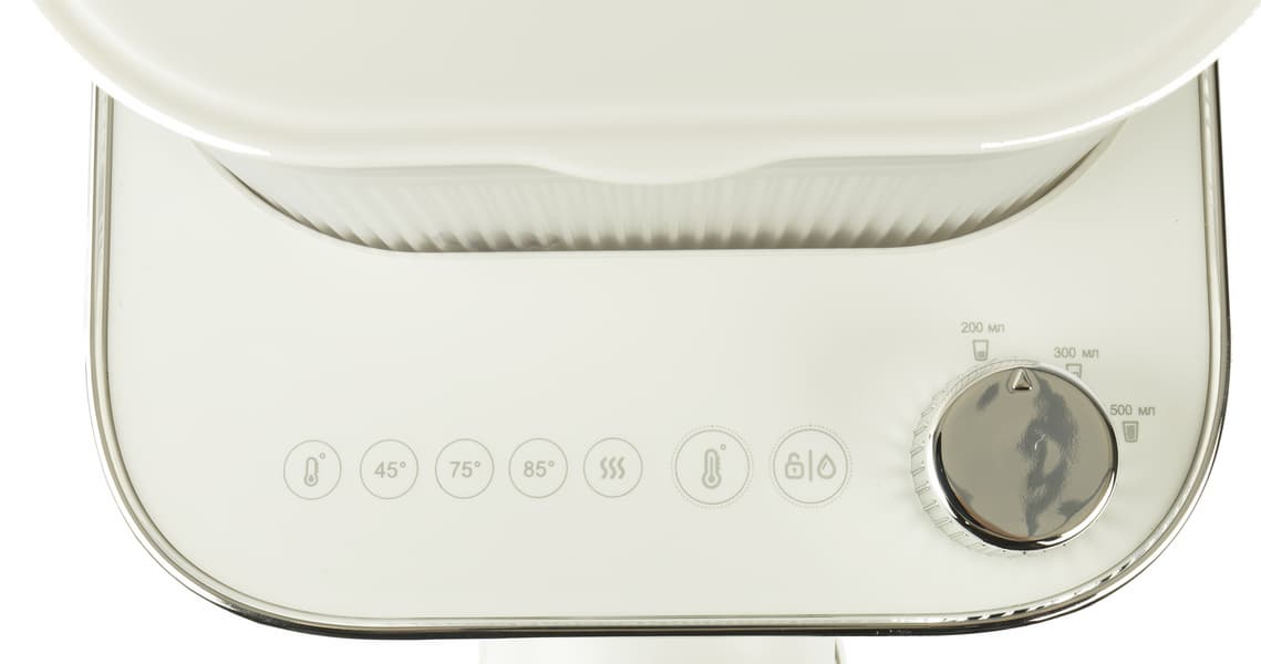 Управление у Rawmid RMK-01 электронно-механическое. Круглая серебристая ручка отвечает за выбор объема порции: устройство может наливать горячую воду по 200, 300 и 500 мл.