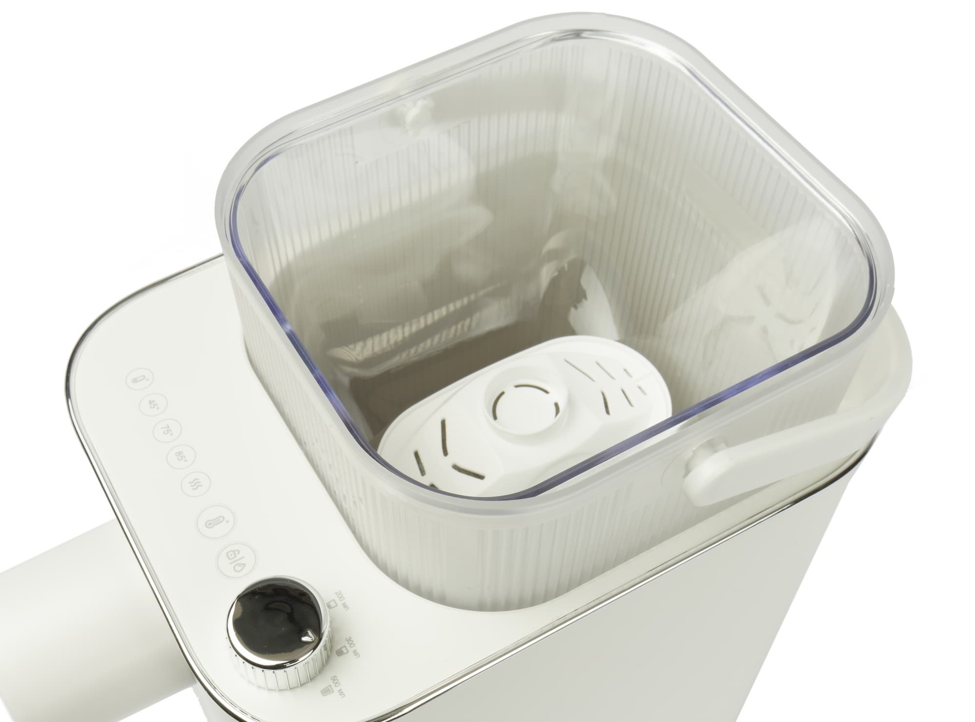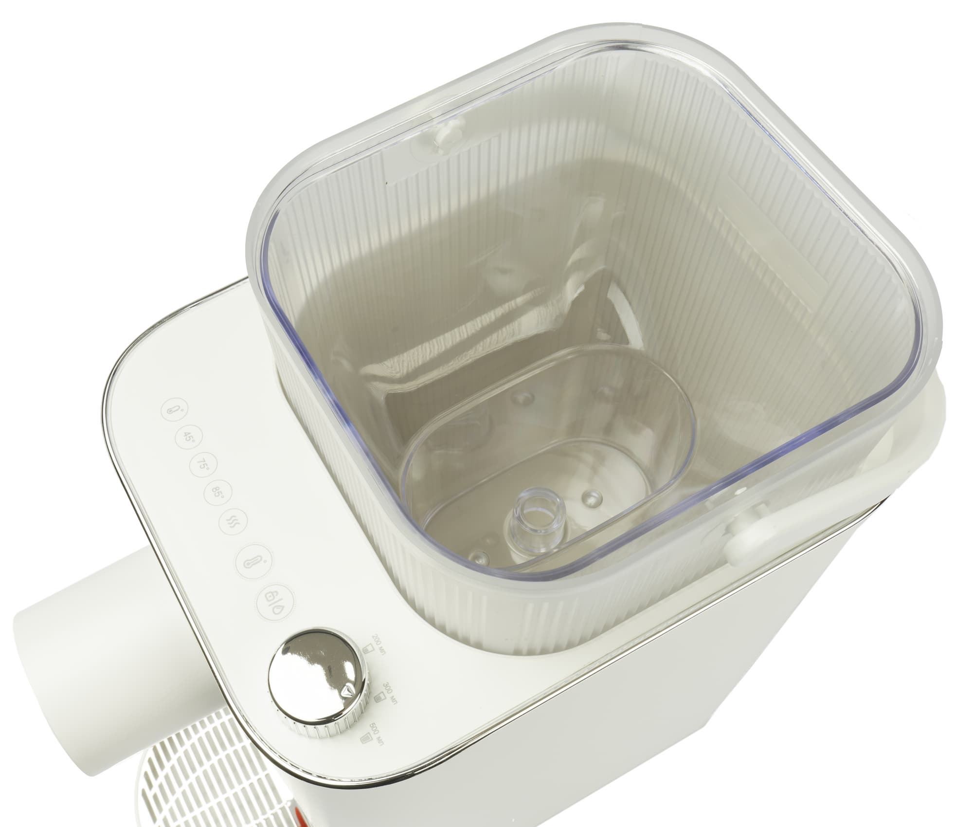 Над верхней панелью выступает серый полупрозрачный бак для воды, закрывающийся съемной крышкой из такого же белого пластика, как и корпус.