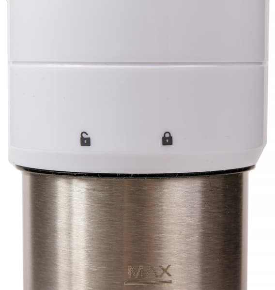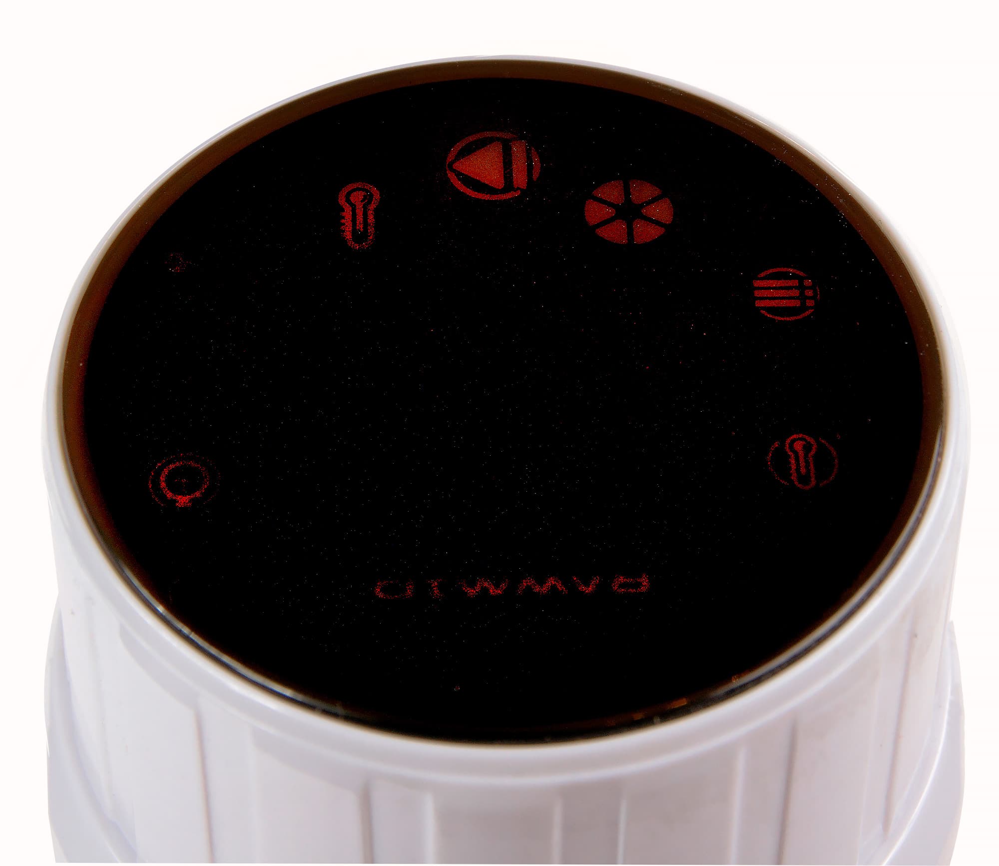 Верхняя часть корпуса, в которой прячется мотор и блок управления, сделана из белого пластика. Панель управления состоит из регулировочного кольца, с помощью которого можно изменять настройки, и светодиодной панели с сенсорными кнопками. Кольцо проворачивается с негромким пощелкиванием и характерным тактильным ощущением (примерно как колесо обычной компьютерной мыши).