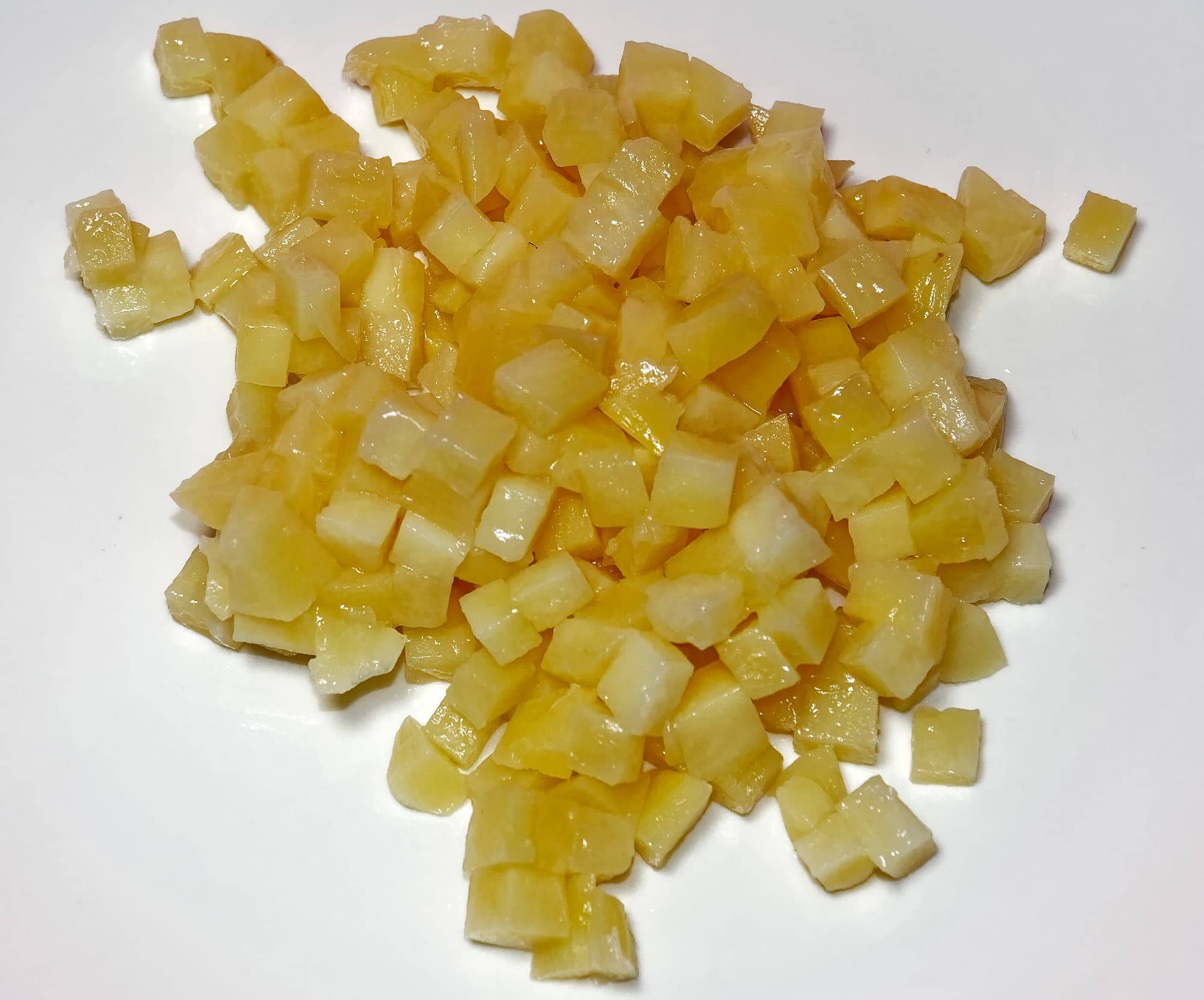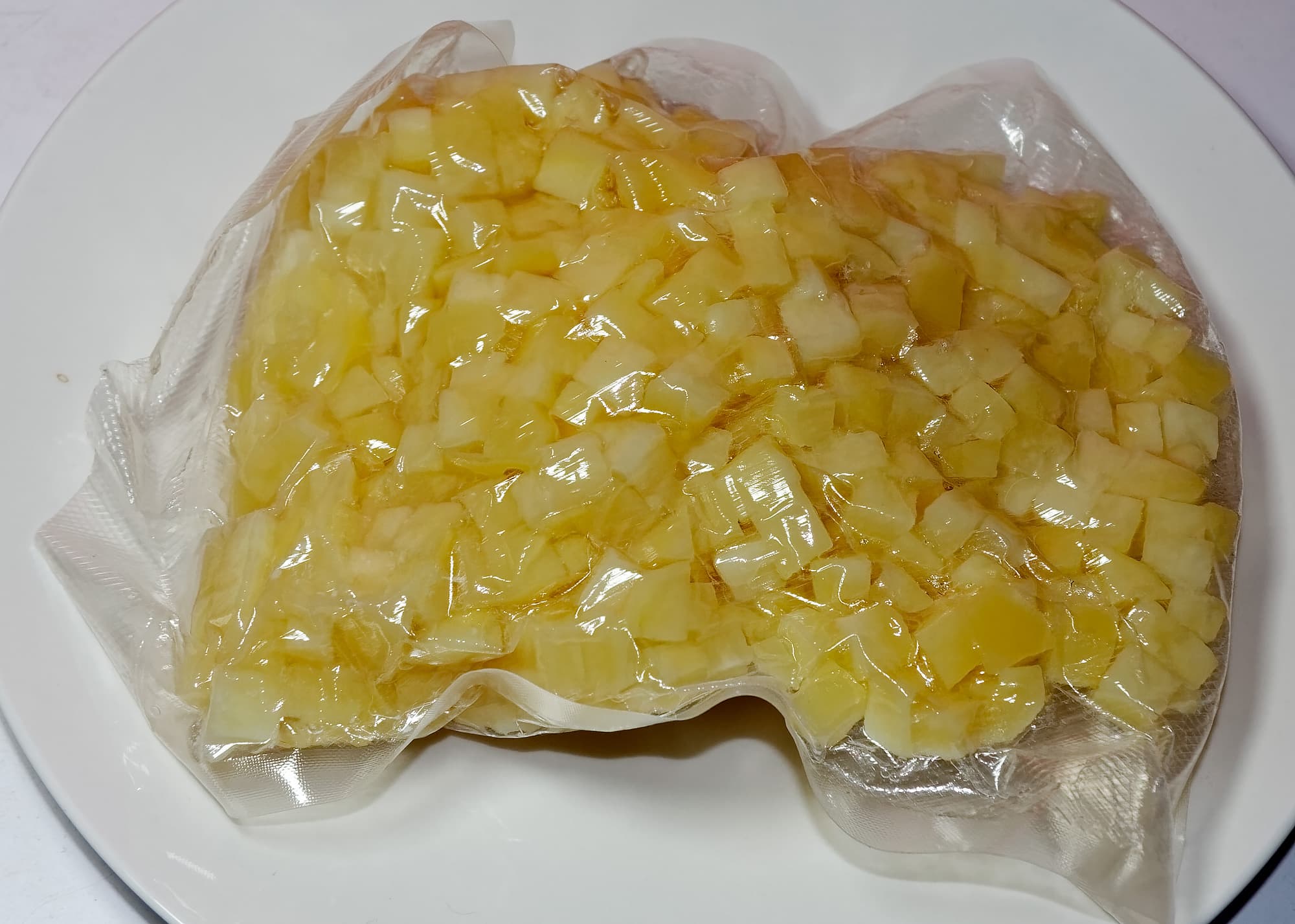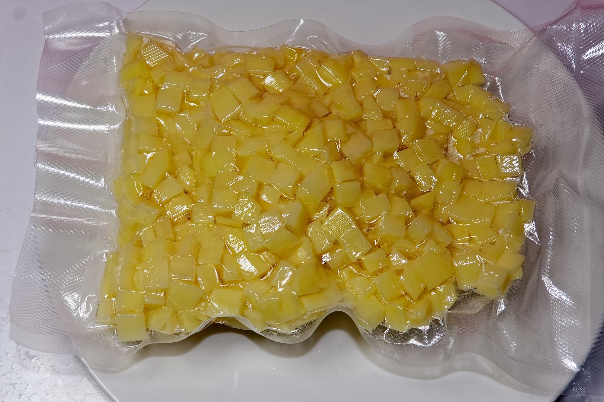 Молодой картофель мы очистили, нарезали на кубики и вакуумировали с добавлением небольшого количества соли.