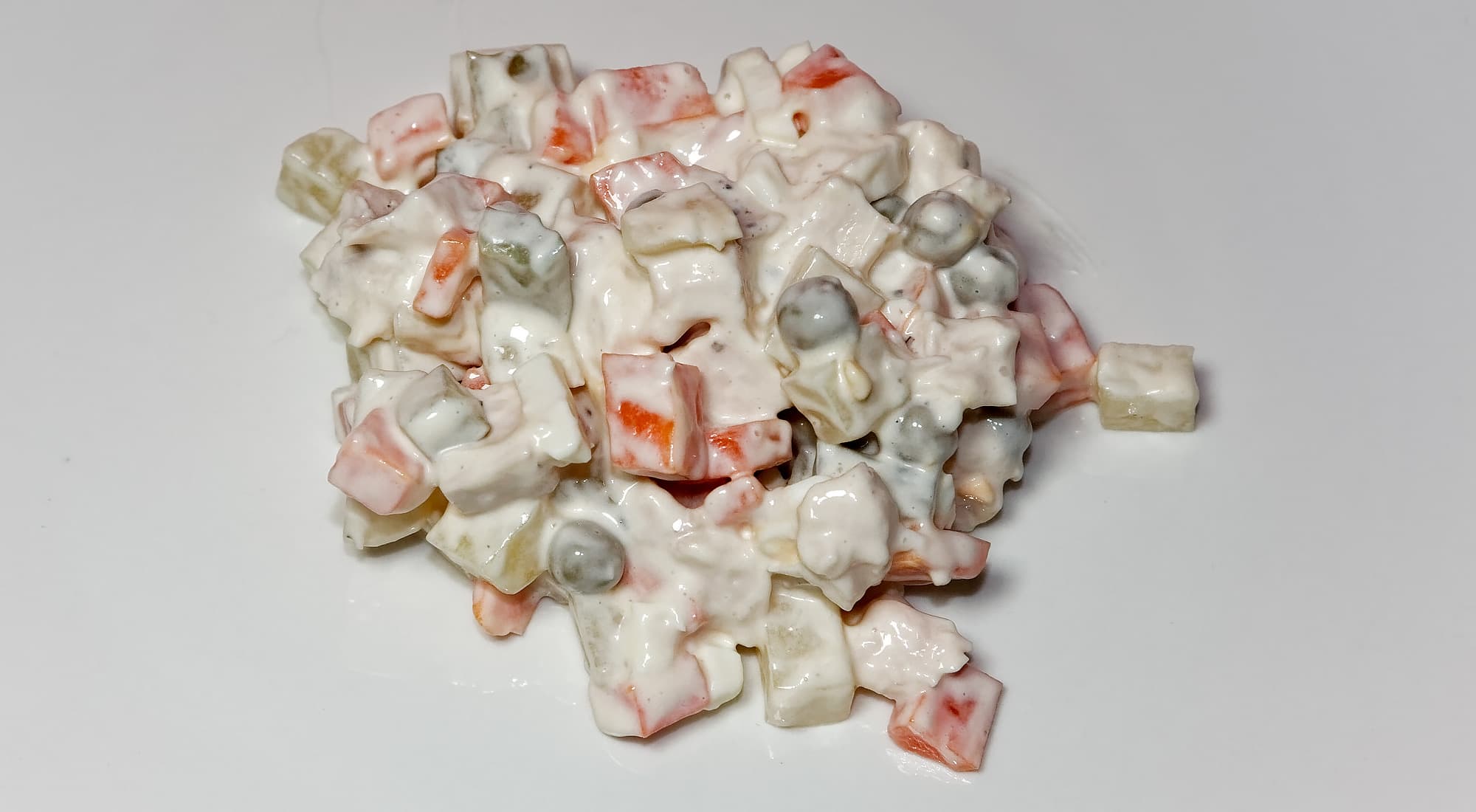 Из всех ингредиентов мы приготовили салат, напоминающий хорошо знакомый всем Оливье: смешали картофель, морковь, курицу, добавили измельченные вареные яйца, нарезанный соленый огурец, консервированный горошек и майонез.