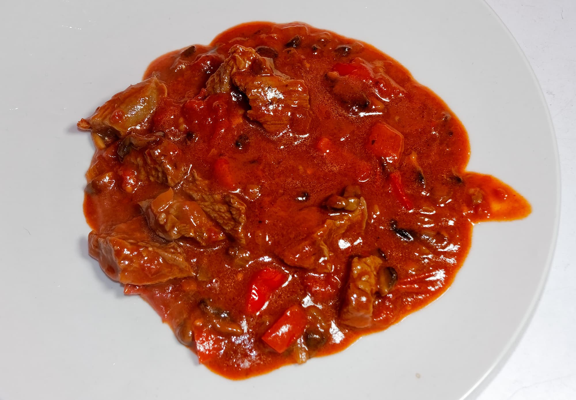 Дальнейшее приготовление происходит как обычно — достаем мясо из пакета, кладем в кастрюлю, заливаем процеженным собственным соком, добавляем томат (мы взяли консервированные кусочки томата), болгарский перец и тушим до готовности. Затем вводим мучную жировую пассеровку, пассерованный лук, жареные грибы, доводим до вкуса и увариваем соус в течение 5-7 минут.