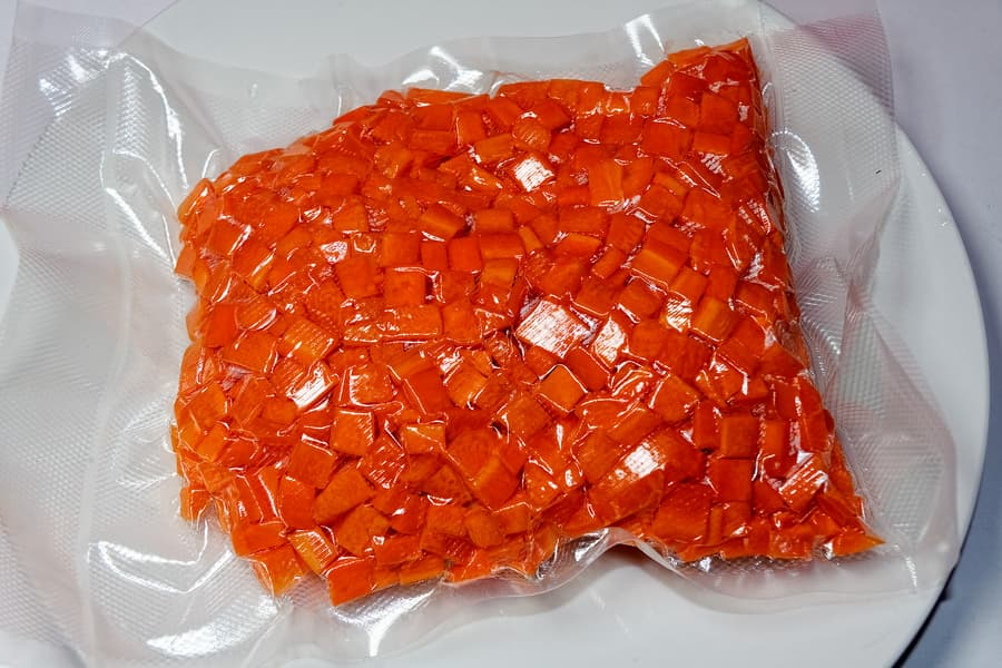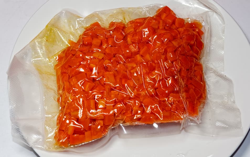 Подготавливая таким образом продукты для, например, салата, стоит помнить об этой особенности су-вида и не лениться при нарезке: слишком большие кубики моркови не составят большой проблемы в случае, если морковь просто отваривается в кастрюле, но будут очень хорошо заметны в случае приготовления в су-виде.