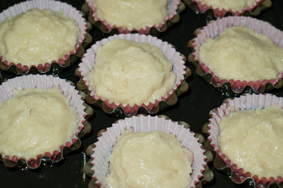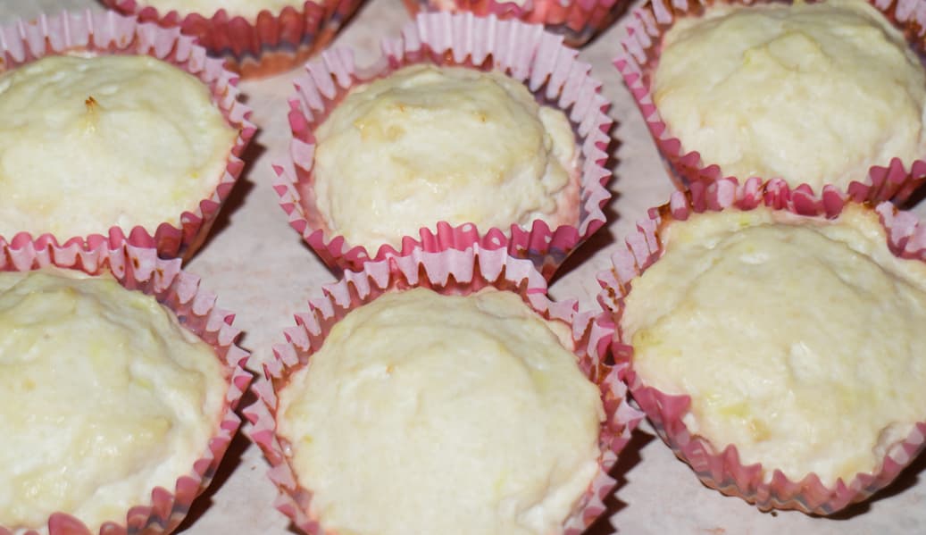 Выложили в миску, добавили пару ложек манной крупы, хорошо перемешали и оставили на некоторое время. Затем выложили в формочки. Запекали на 160 °C около 45 минут.
