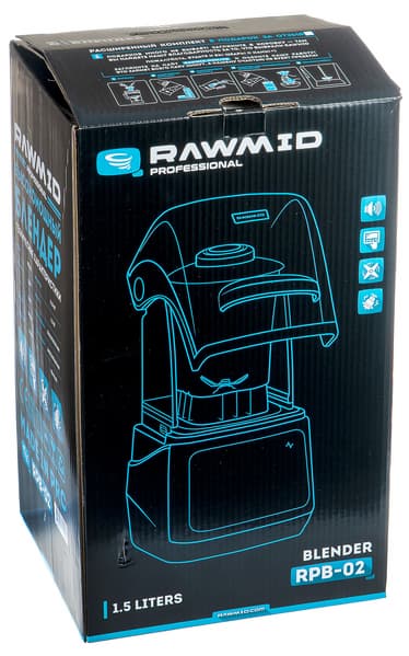 Стационарный блендер RAWMID Professional RPB-02 попал в наши руки в двух коробках. На сторонах внешней транспортировочной, изготовленной из толстого коричневого картона, приведены общие сведения о приборе, правила его транспортировки и хранения, а также технические характеристики. Вторая, внутренняя упаковка выглядит привычнее для пользователя. Она ярко оформлена: схематическое изображение прибора сопровождено фотографией блендера на фоне ярких продуктов. Основные технические характеристики и описание особенностей аппарата даны как в привычном текстовом формате, так и в виде пиктограмм. Габариты упаковки достаточно велики: 35×58×30,5 см.